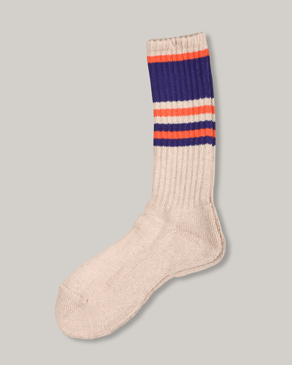 A thick, luscious sports sock in natural coloured cotton and hemp, with differing stripes of purple and green to tantalise your toes.