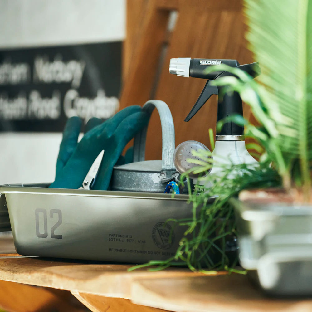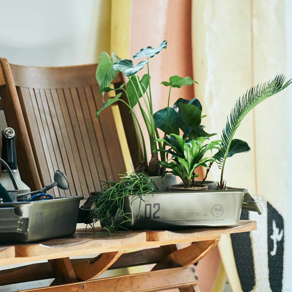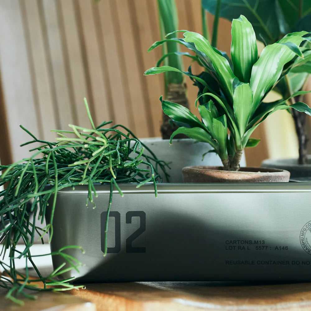Made for Basshu by Toyo, the first company to build a seamless tool box from steel plate. This is then galvanised so is rust-resistant and as there are no seams or holes, there is no part of it which can leak. With two carrying handles for easy mobility. Utilising the well established M8 model, it has been stamped on the side to denote the collaboration.