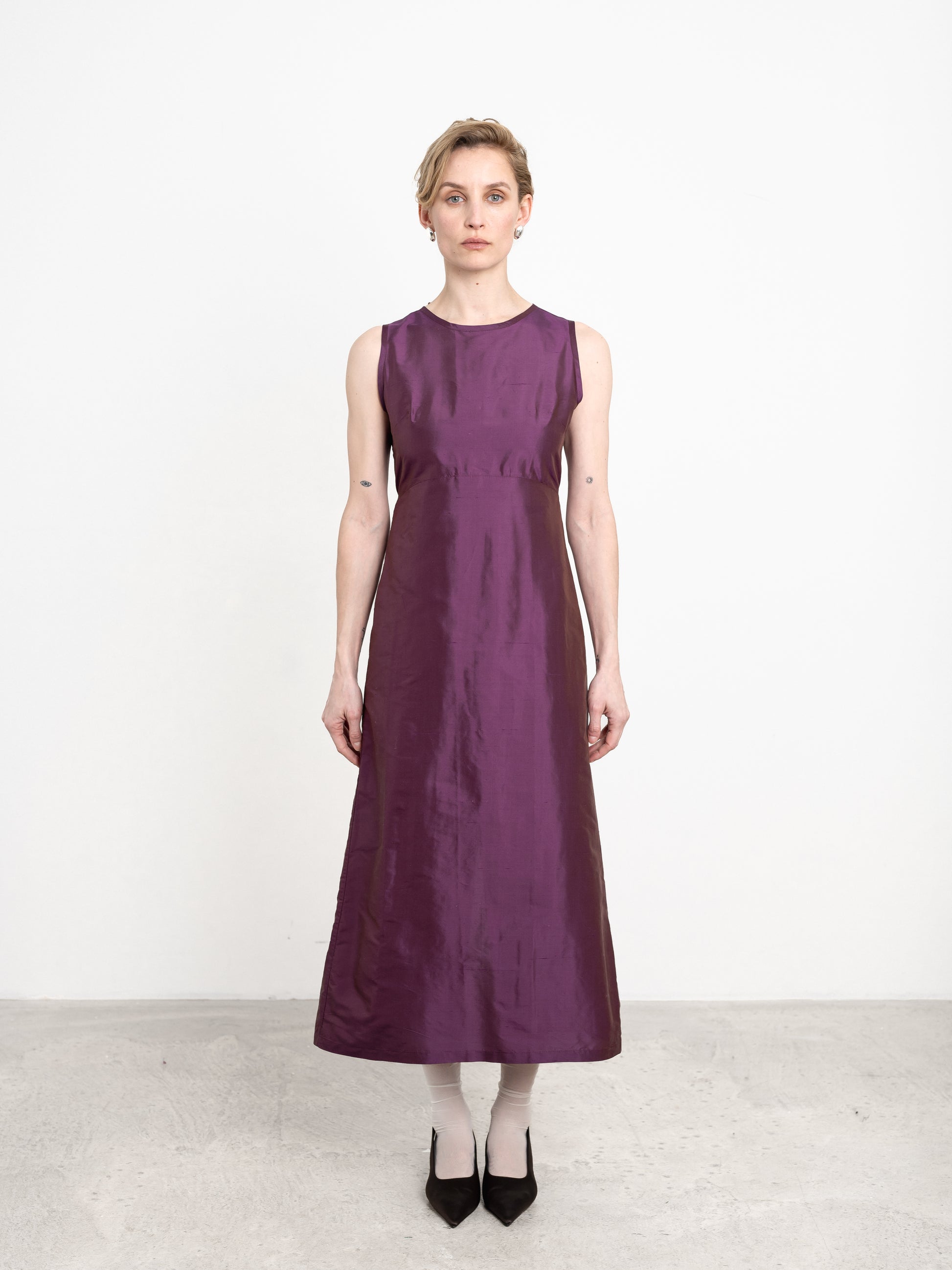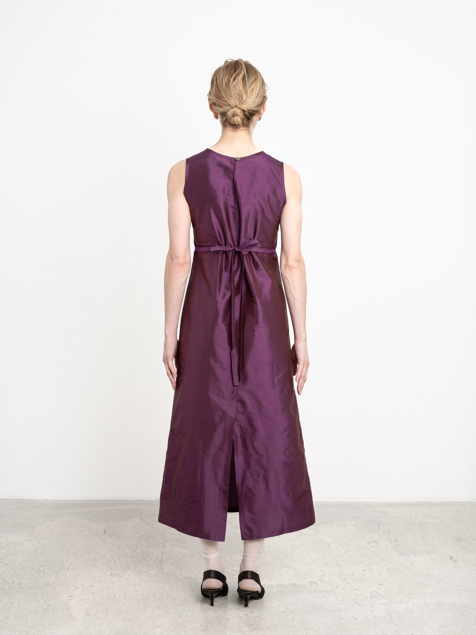 New for AW25, the Erika dress is made in a deep plum coloured silk dupion, perfect for a special occasion or daily layering. With a sleek and simple silhouette, the dress features a tie to cinch in the waist, a back hem slit, and a shell button and keyhole closure.