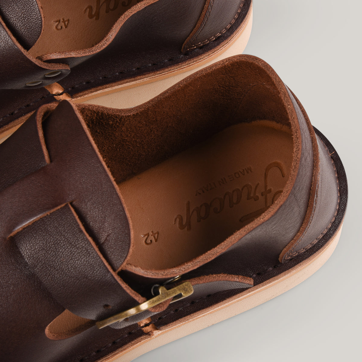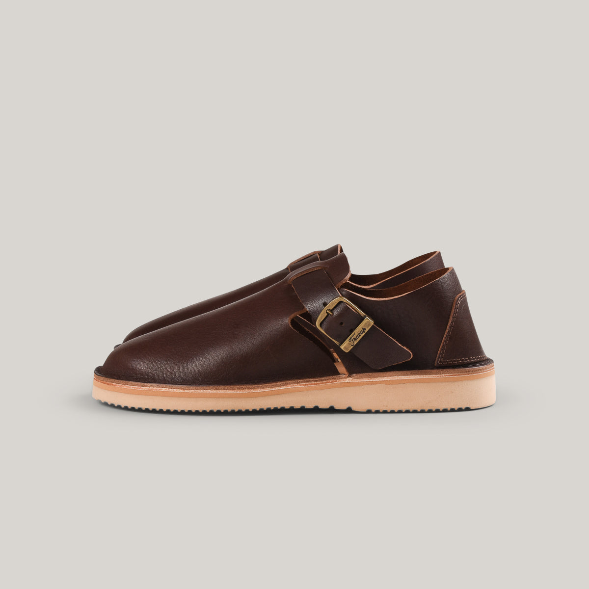 The answer to your summer sandal quandary, using a natural calf leather innersole, a Moro upper then beige midsole and a rippled beige Prunella Vibram sole that is as tough as old sandals. Paired with a brass buckle to keep your feet in check, these look quality with trousers, jeans and shorts alike.