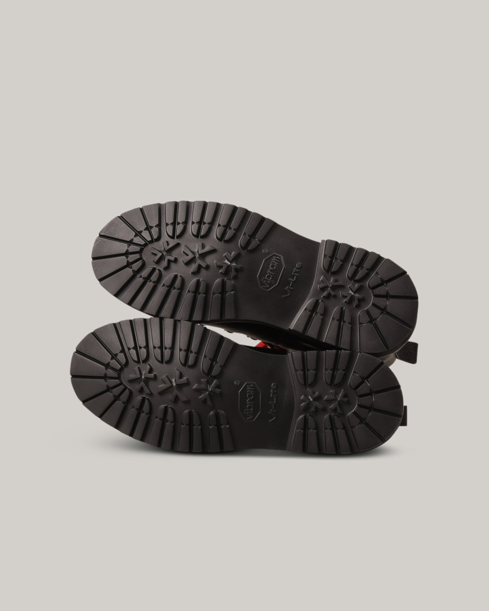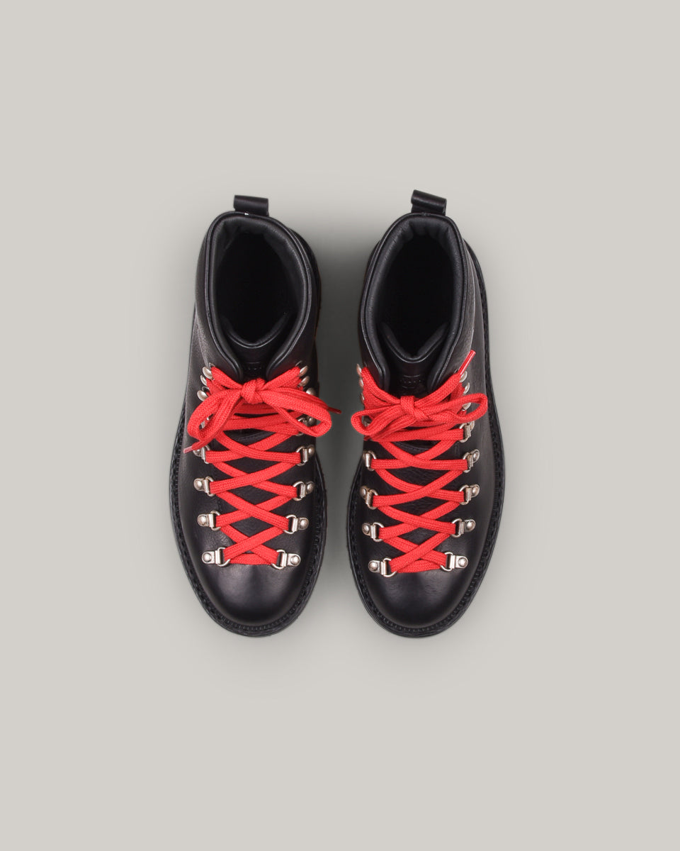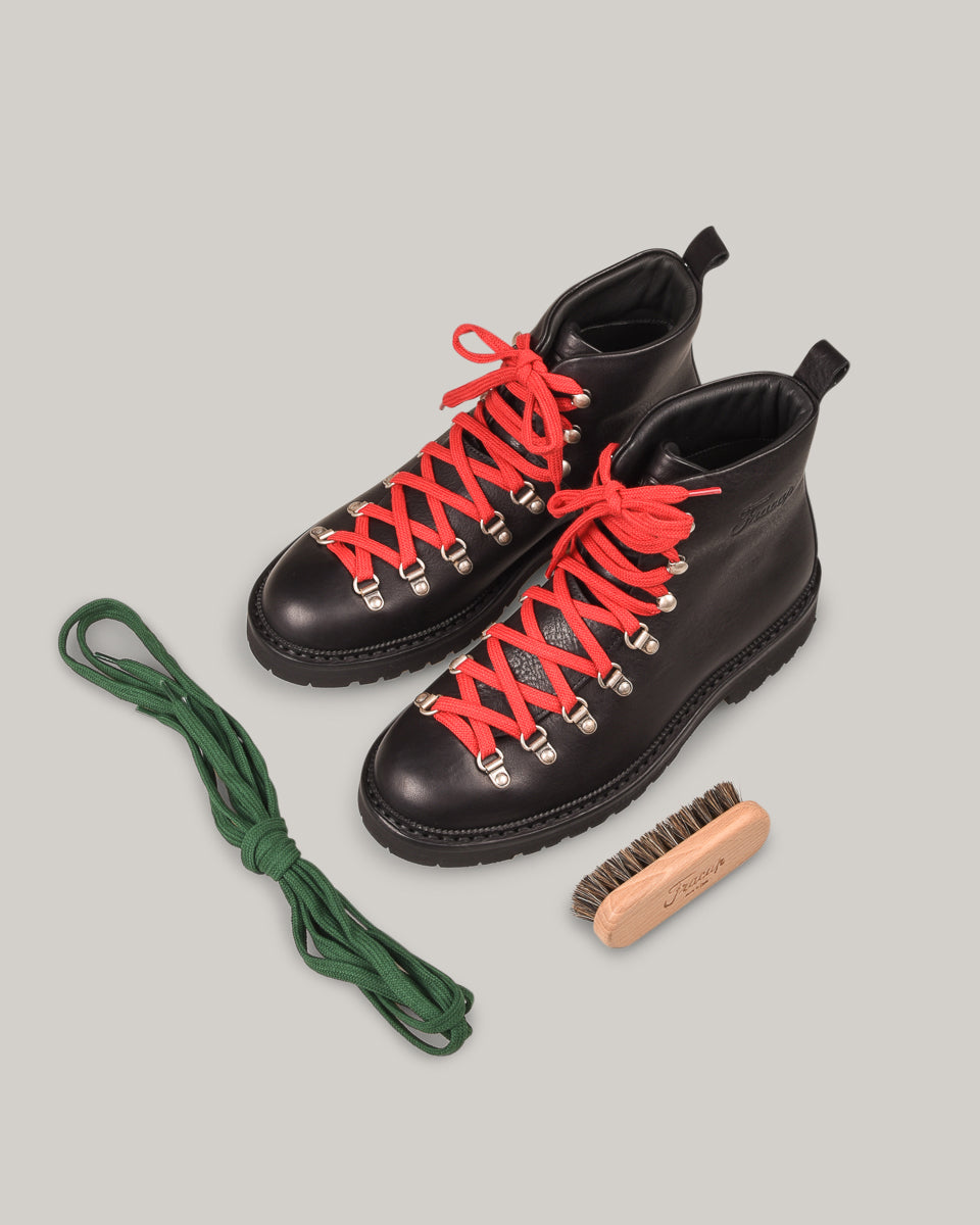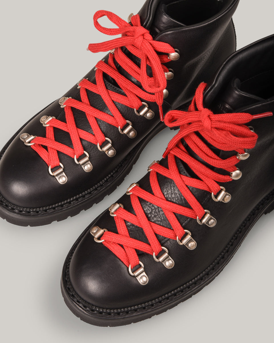 The most classic of European vintage hiking boots, featuring a 5" high upper, complete with antique silver 'D' ring eyelets and speed hooks up top.  A black commando Vibram sole graces the bottom, with black leather lining/ inner sole, hand-stitched black zig-zag welt and flat red laces. Complete with spare green laces and horse hair brush.