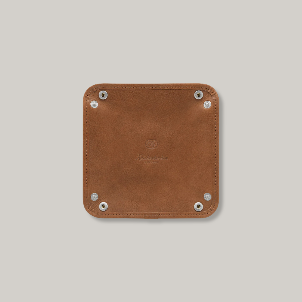 The genius of this version of a valet tray is the metal snaps on each corner, allowing it to be packed flat and used whenever you travel to keep all your worldly possessions together amidst the whirling dervishes of your expedition. Stamped.