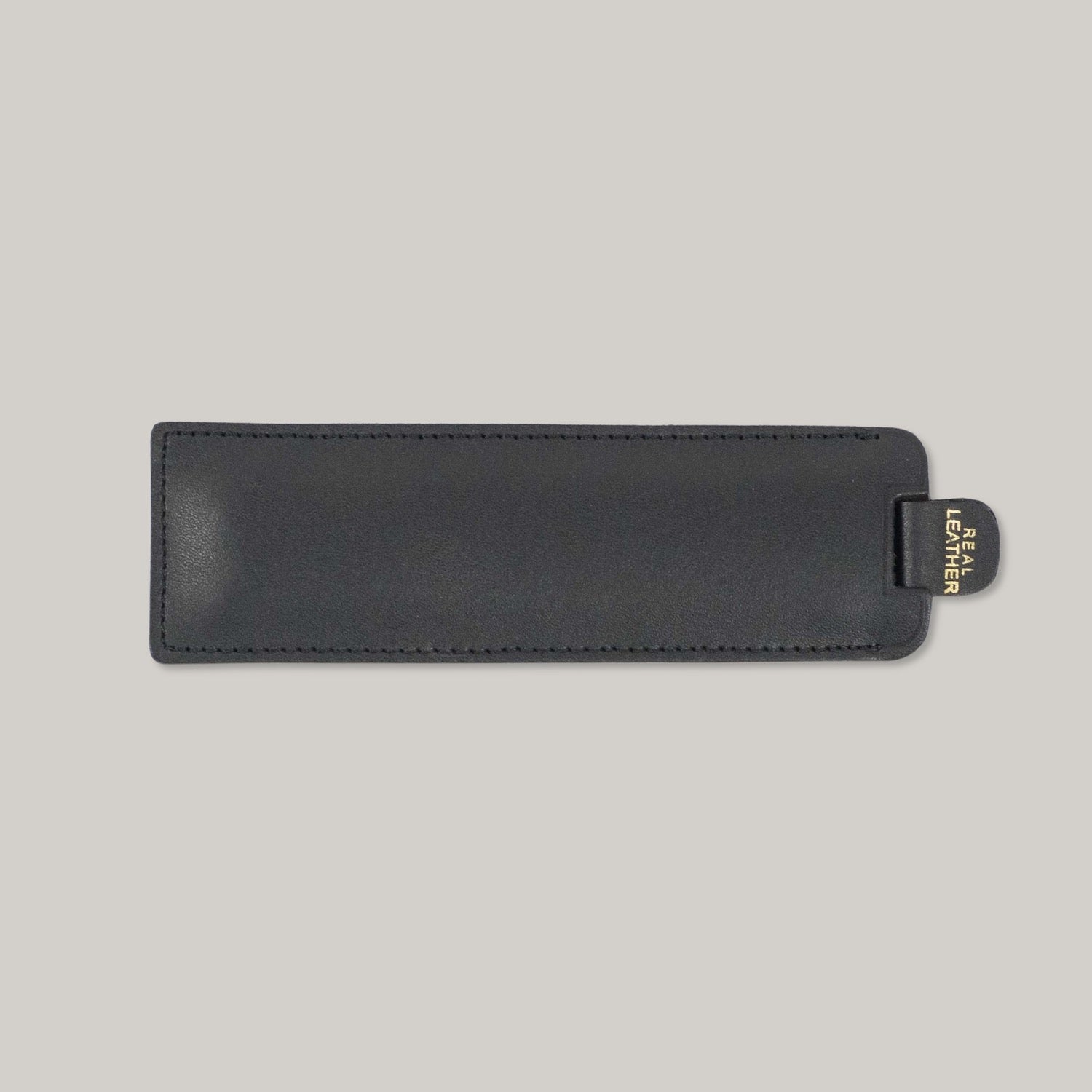 112mm fine toothed pocket comb with carissa calf leather tab and case. Hand cut and polished from high density acetate.