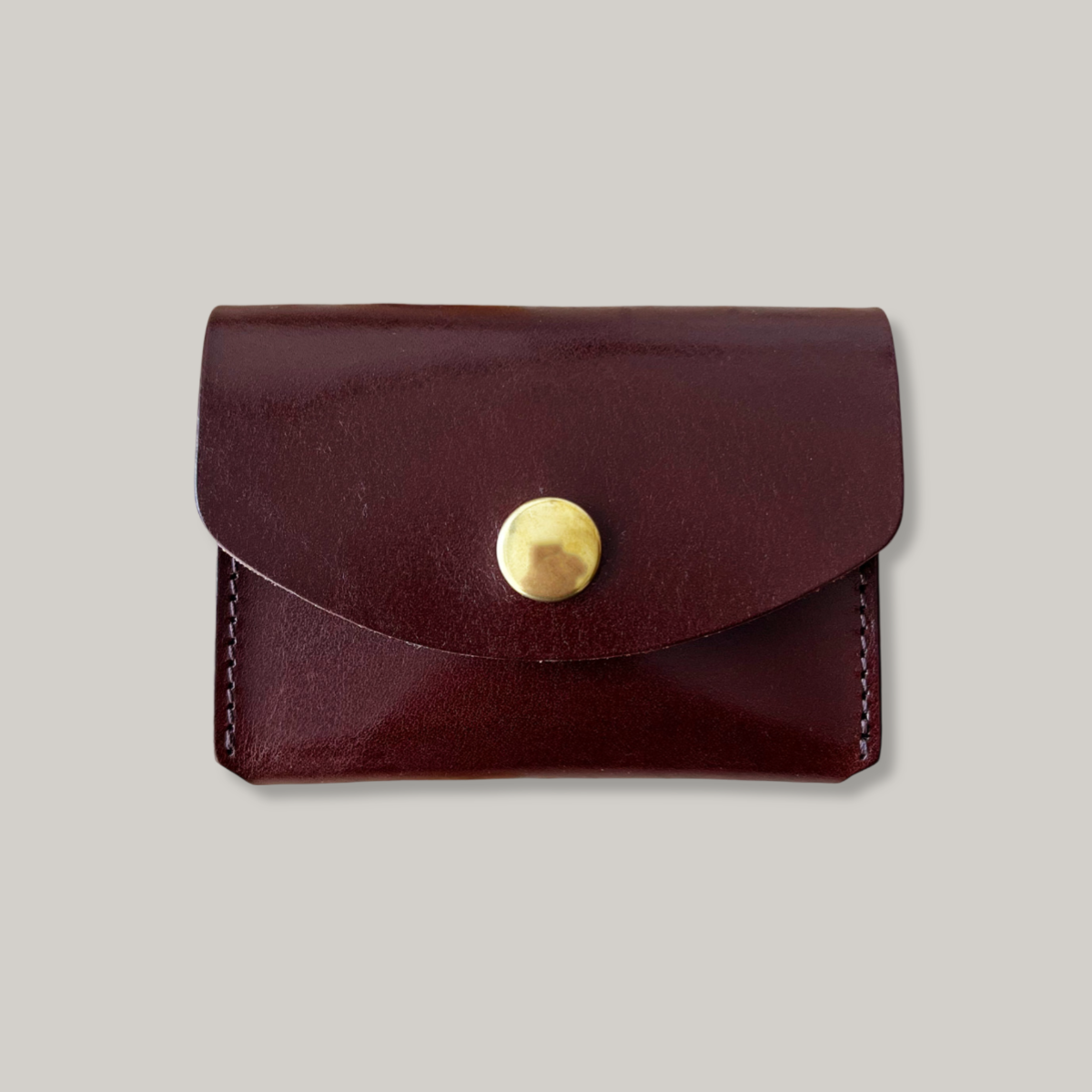 Card case style compact wallet, dark brown colour. Holds up to 12 cards. Smart style for carrying cards, folded bills and coins all in one. Shiny Kobashi Studio original saddle leather, 100% vegetable pit tannage manufactured by a tannery in Himeji established in 1905. Edges polished and dyed by hand. Minimalist, clean design with no visible logo by Junichi Kobashi. Comes with a wax paper envelope.