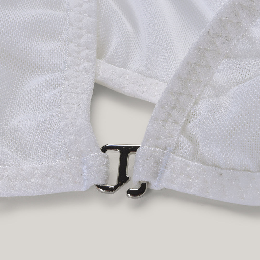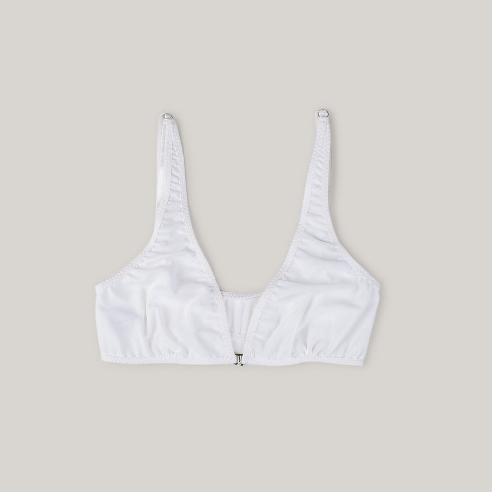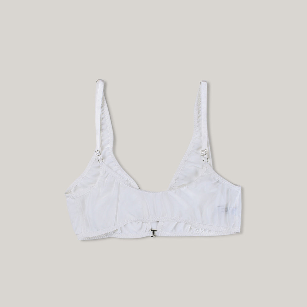 Front-closure bra featuring a double layer of premium deadstock mesh sourced from warehouses in Los Angeles. A dramatic plunge slopes toward a silver hook while adjustable straps provide gentle, wireless support. Inspired by the quietude of being underwater, and considered for everyday movement and rest.