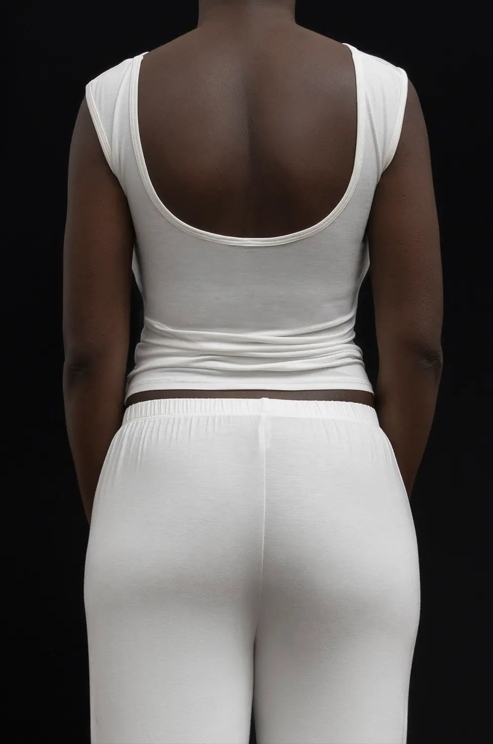 Elegant wide neckline sleeveless tank, open back, fitted silhouette, perfect hip length. Made from a luxuriously soft, environmentally-conscious bamboo.