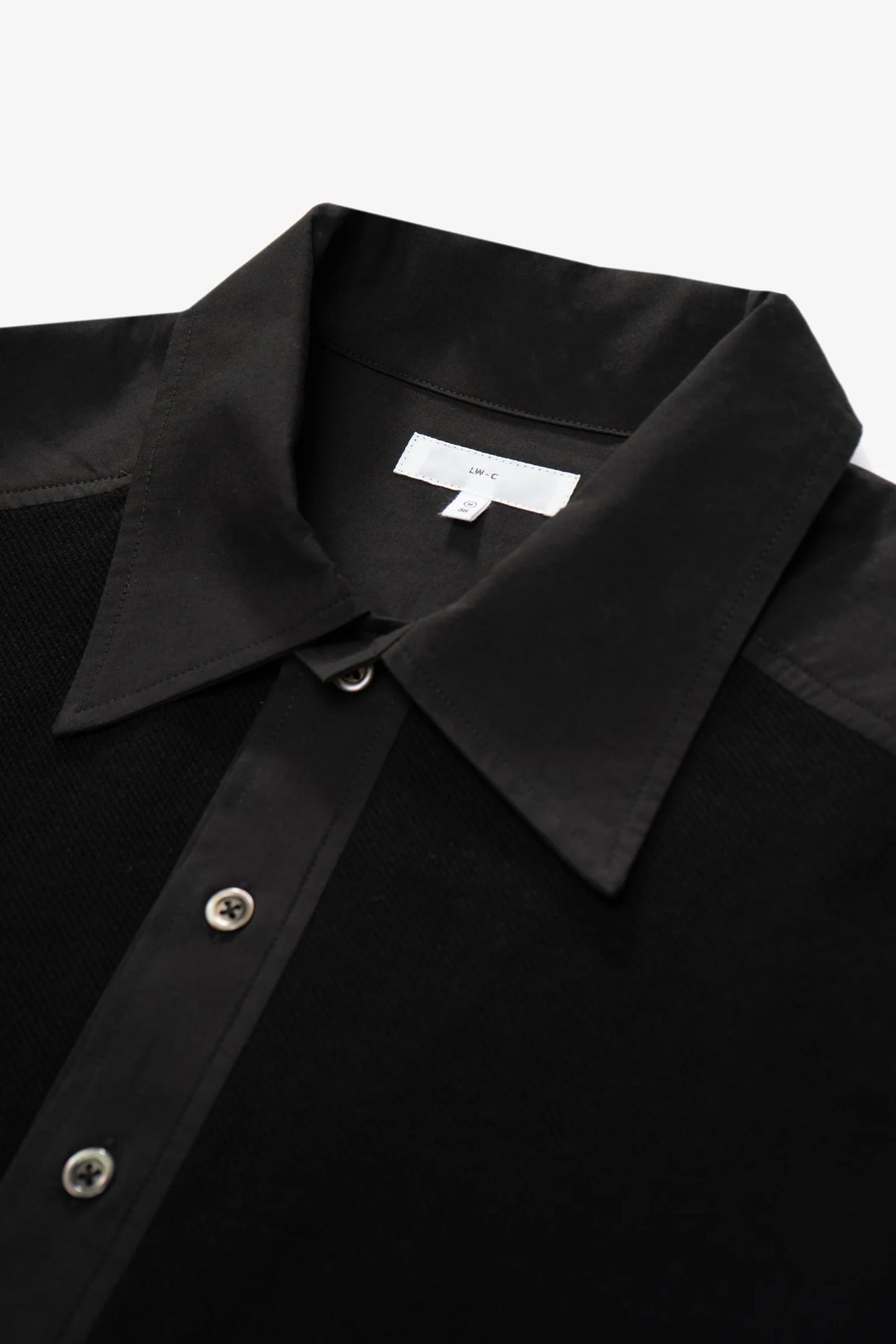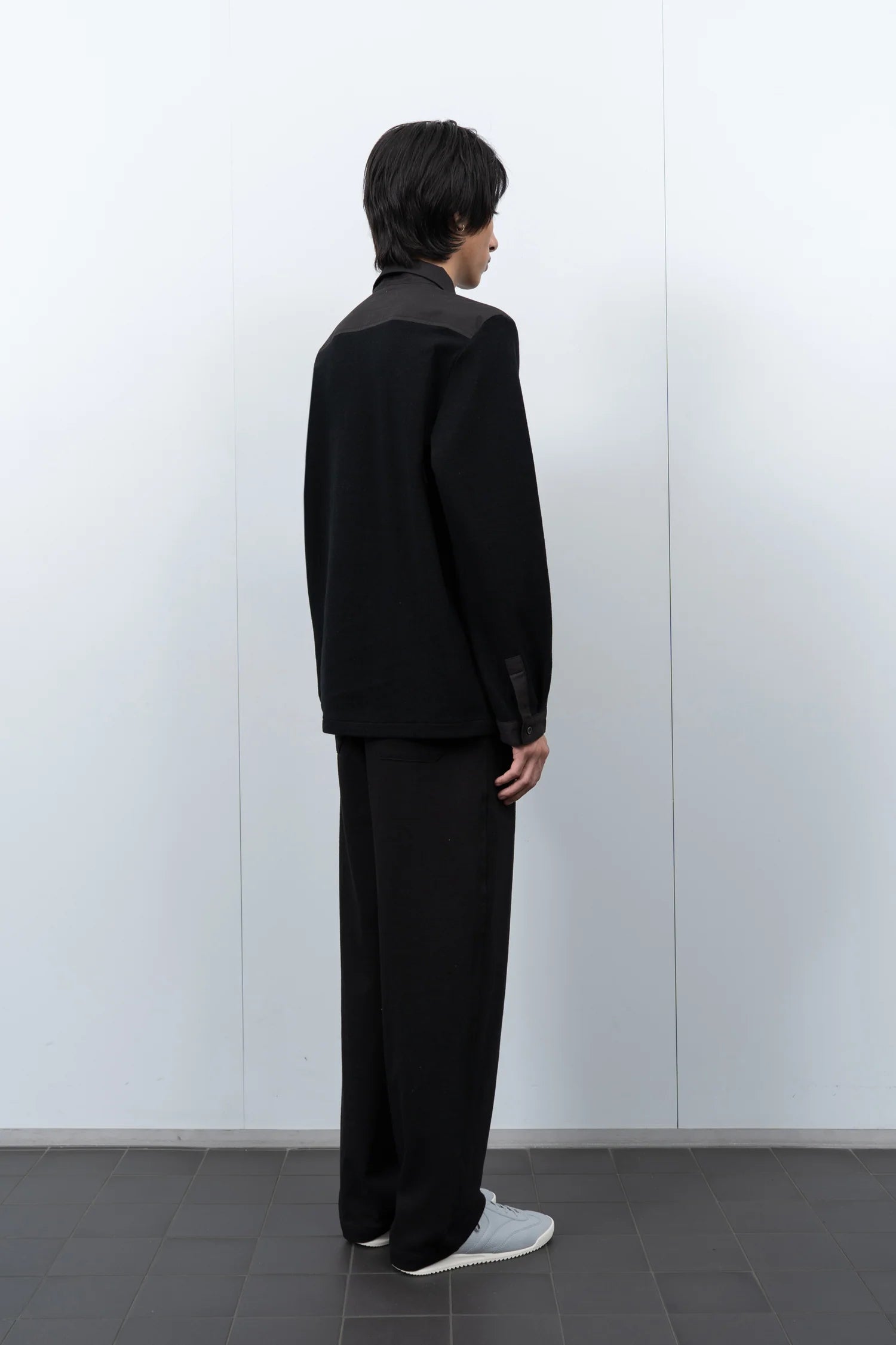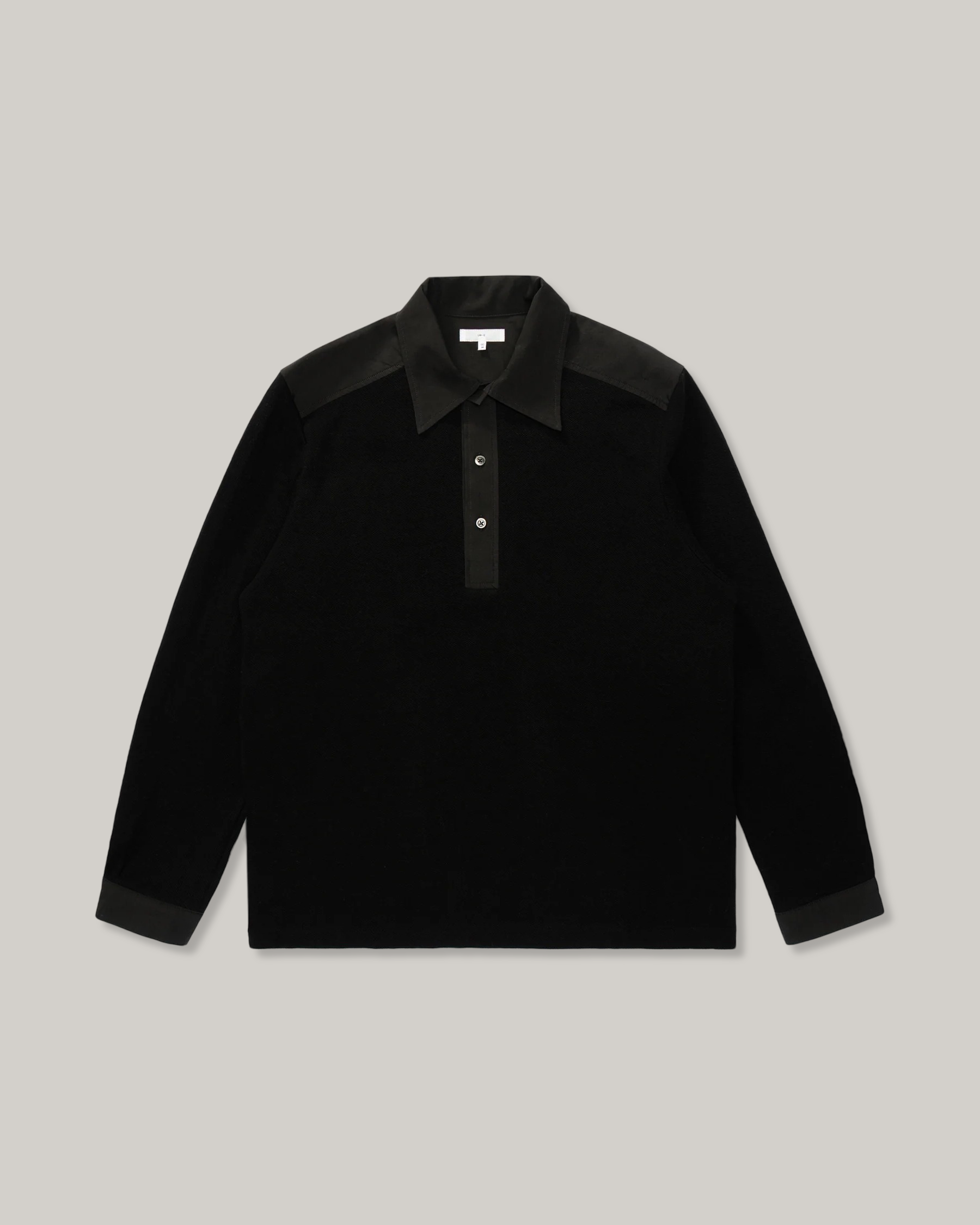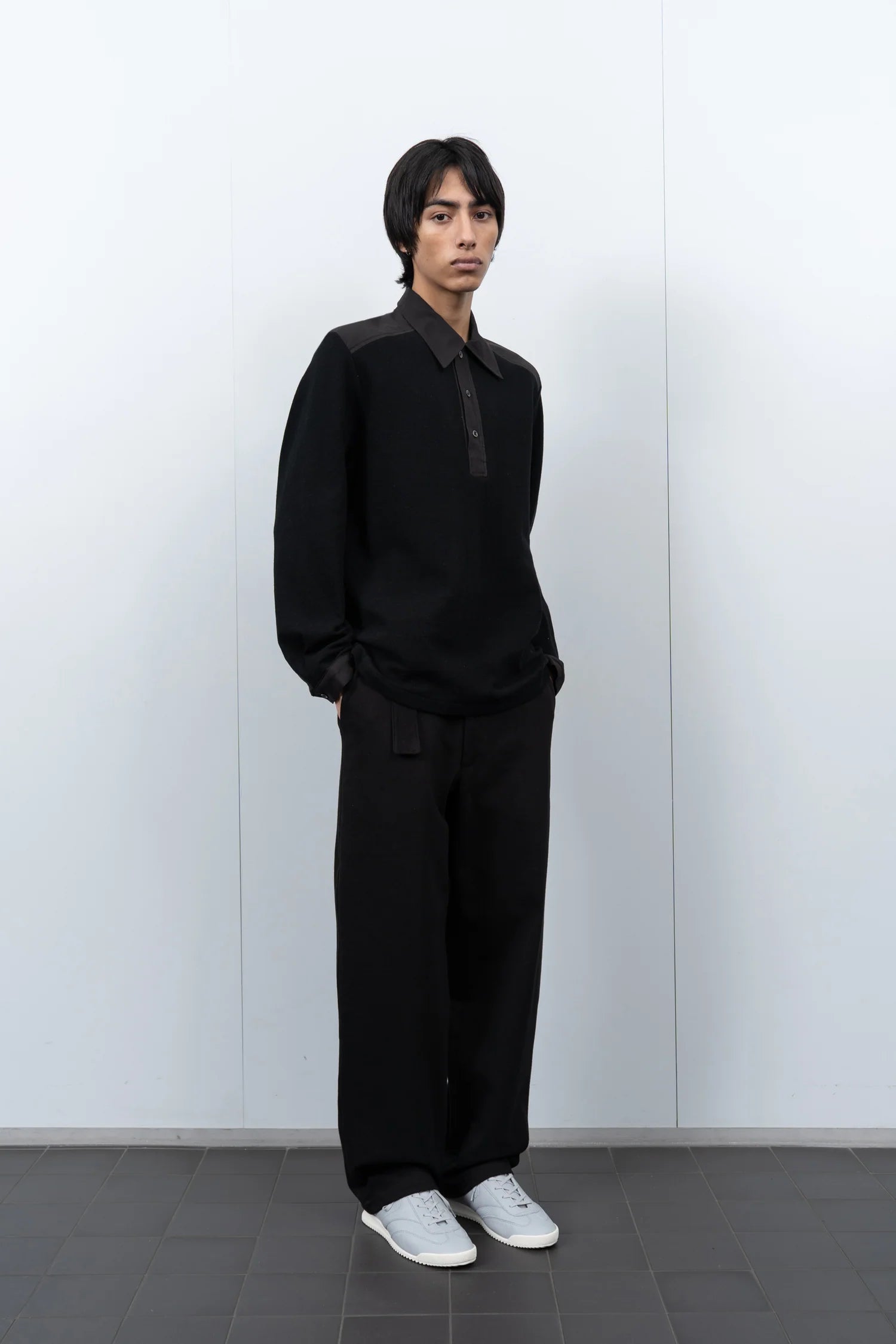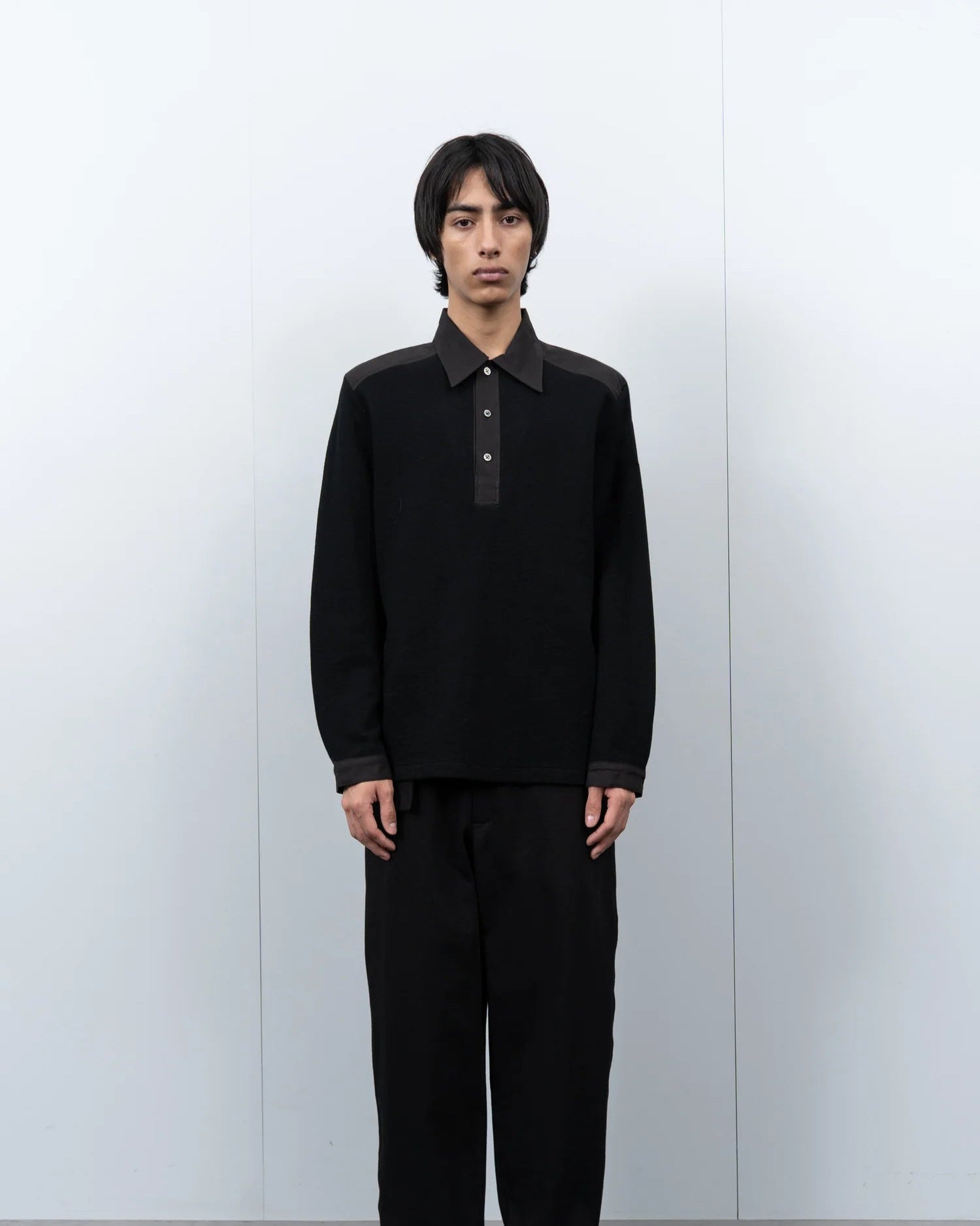The LW415CL Double Knit Polo is a straight, relaxed-fitting polo with a three-button placket, point collar, working cuffs, and a standard length. The wide proportions blend overshirt and pullover styles. cut from a double knit cotton-linen fabric with a smooth, lightly plush hand and a sweater-like drape.