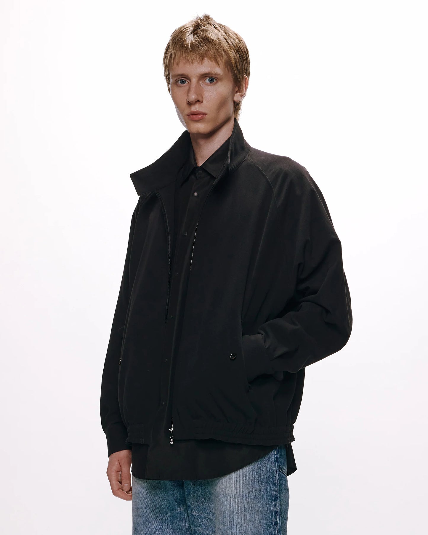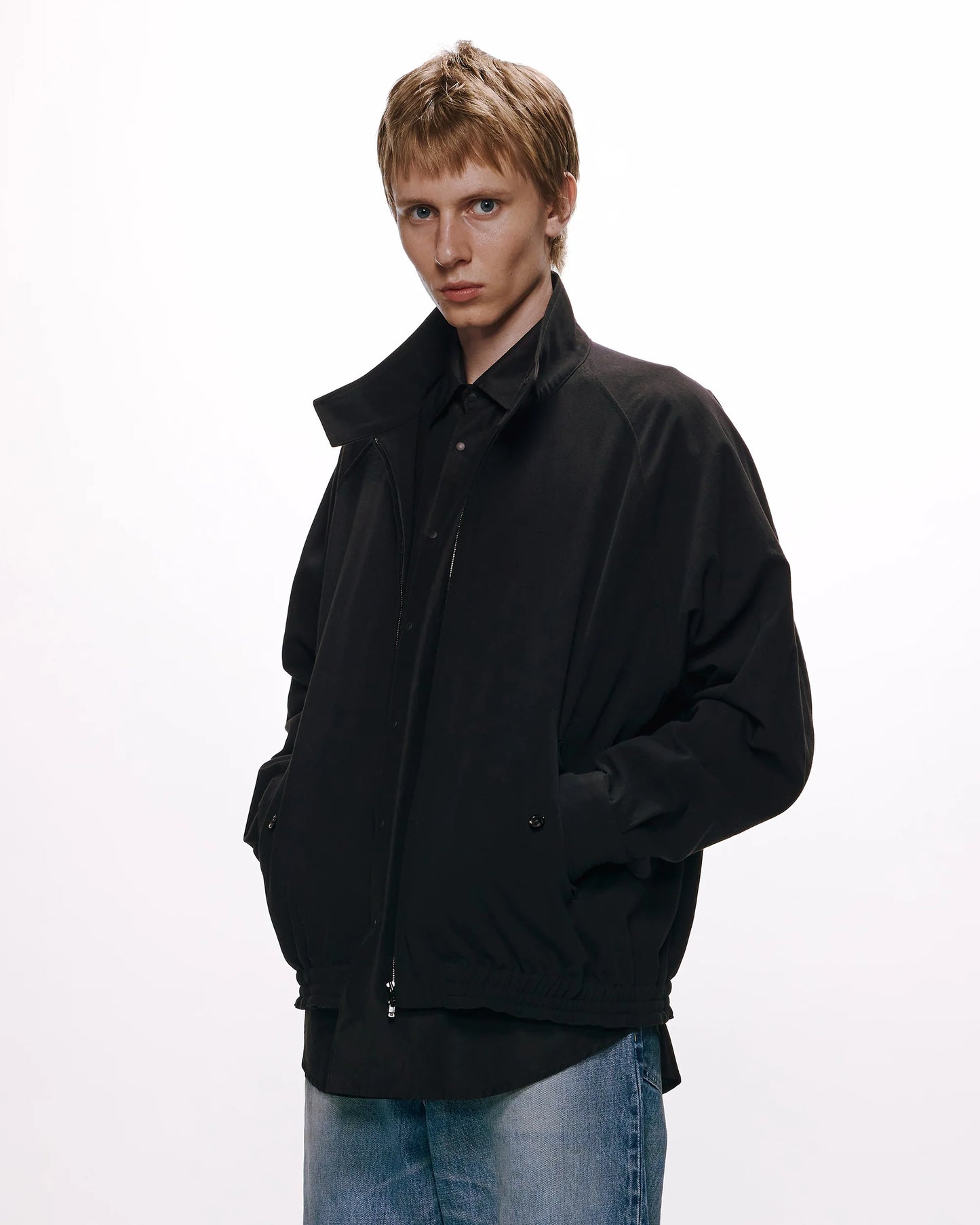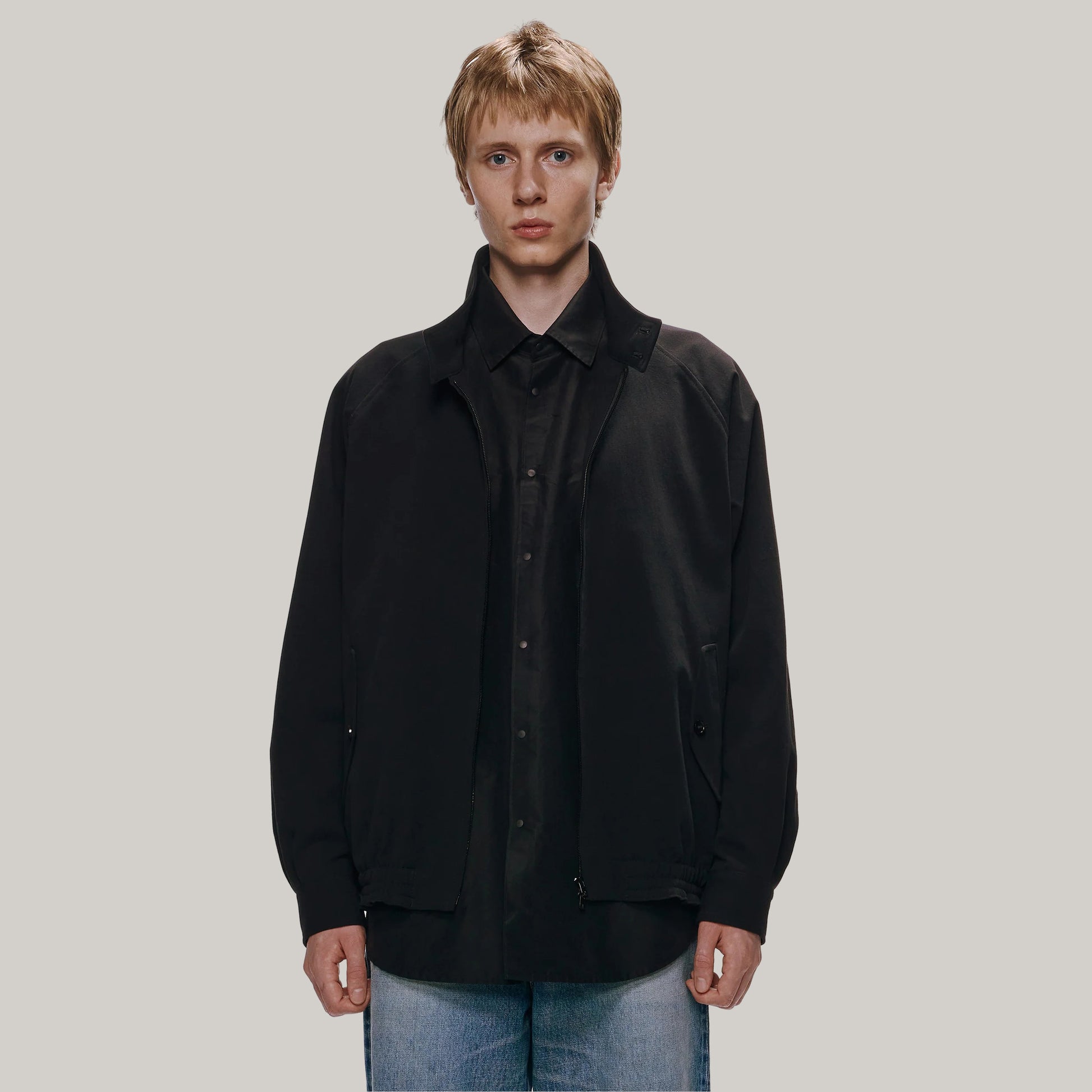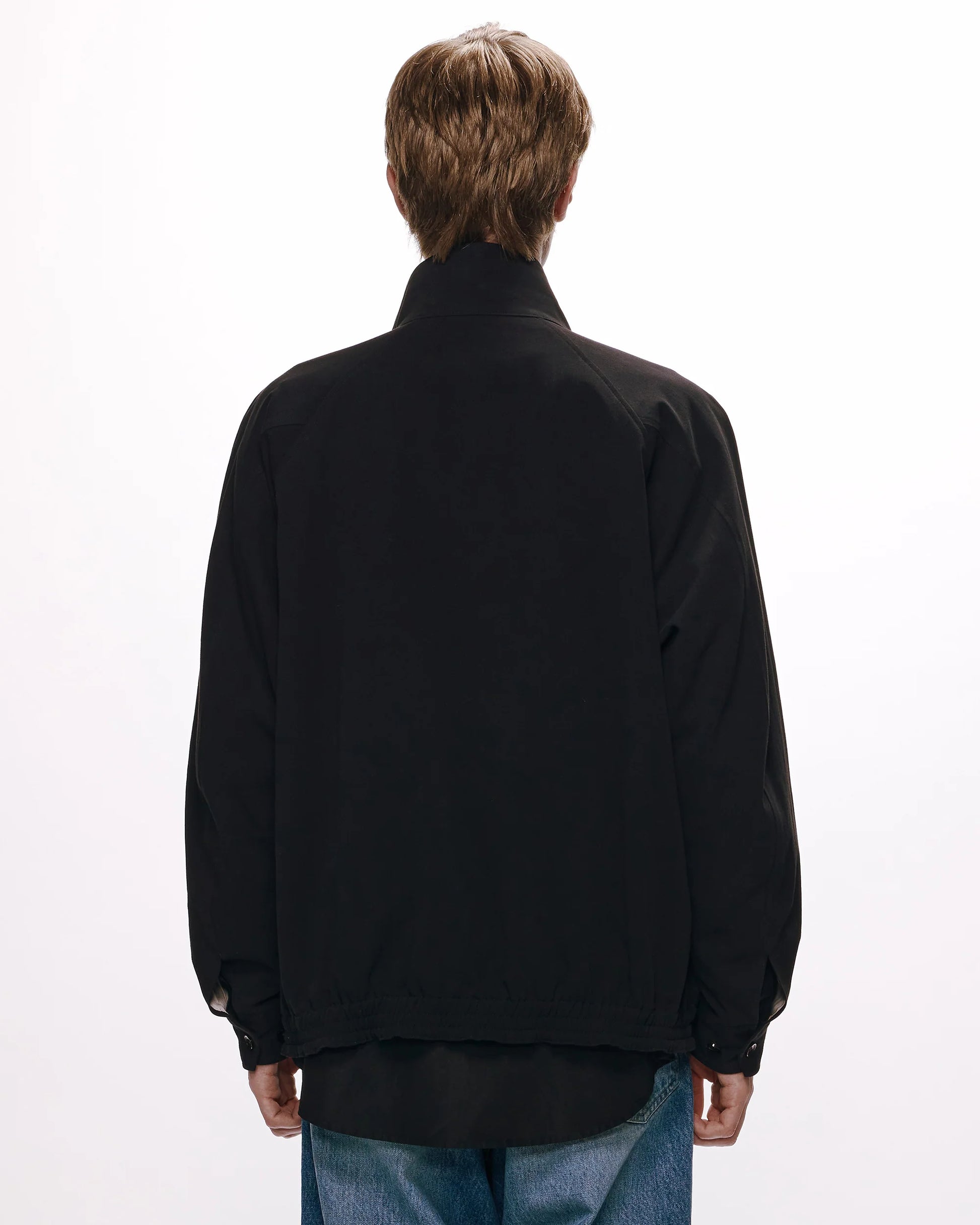 A classic Harrington jacket in stealthy black, with the timeless classic swing top detail. The neckline follows the classic dog-ear collar, which gives a smart impression when the collar is raised. The silhouette is tailored to a relaxed fit, so you can wear it for a long time even as you get older.
