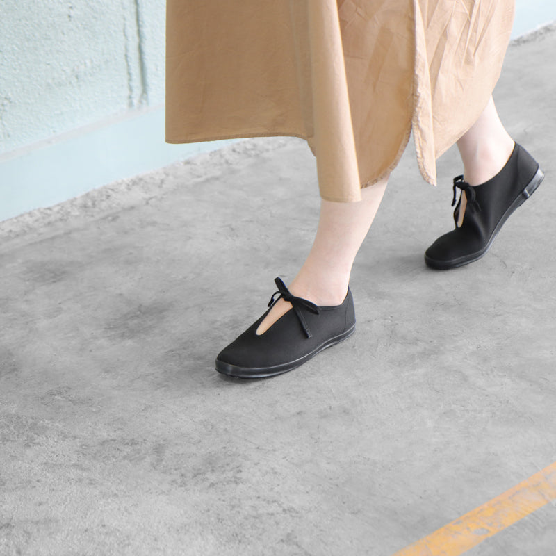 A simple pair of shoes with a single upper in canvas and piping at the opening for shoelaces. The elegant and soft form is accented with a bow.