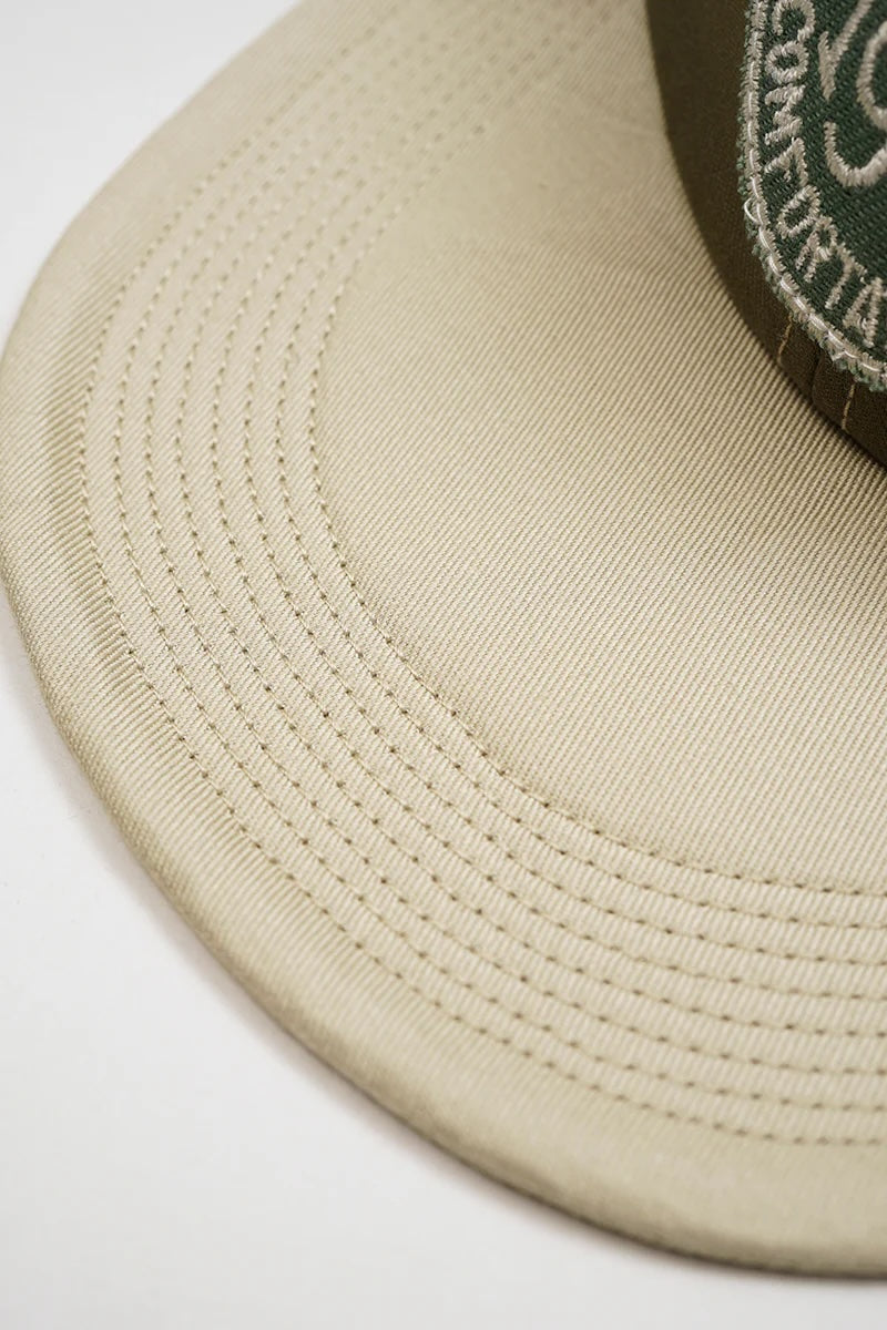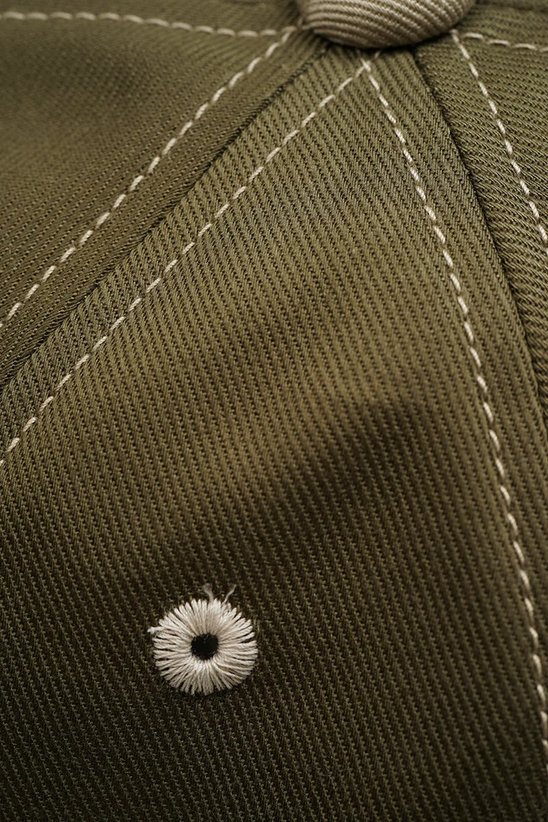 Nifty six panel baseball cap in cotton twill with beautifully designed vintage patch out front and contrasting stitching used on the seams and eyelets, comes in three different colours. Elasticated back and a head circumference of 58cm.