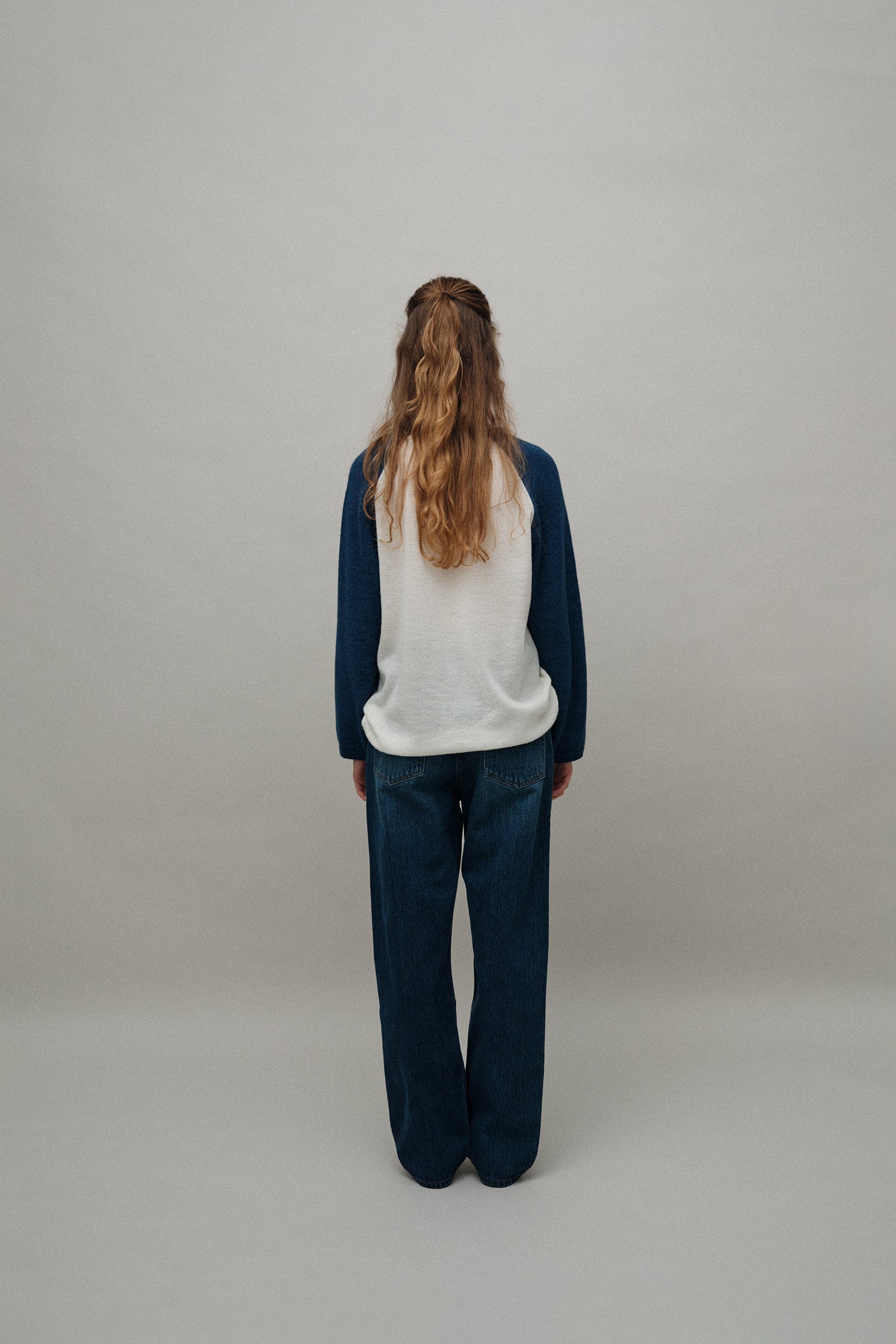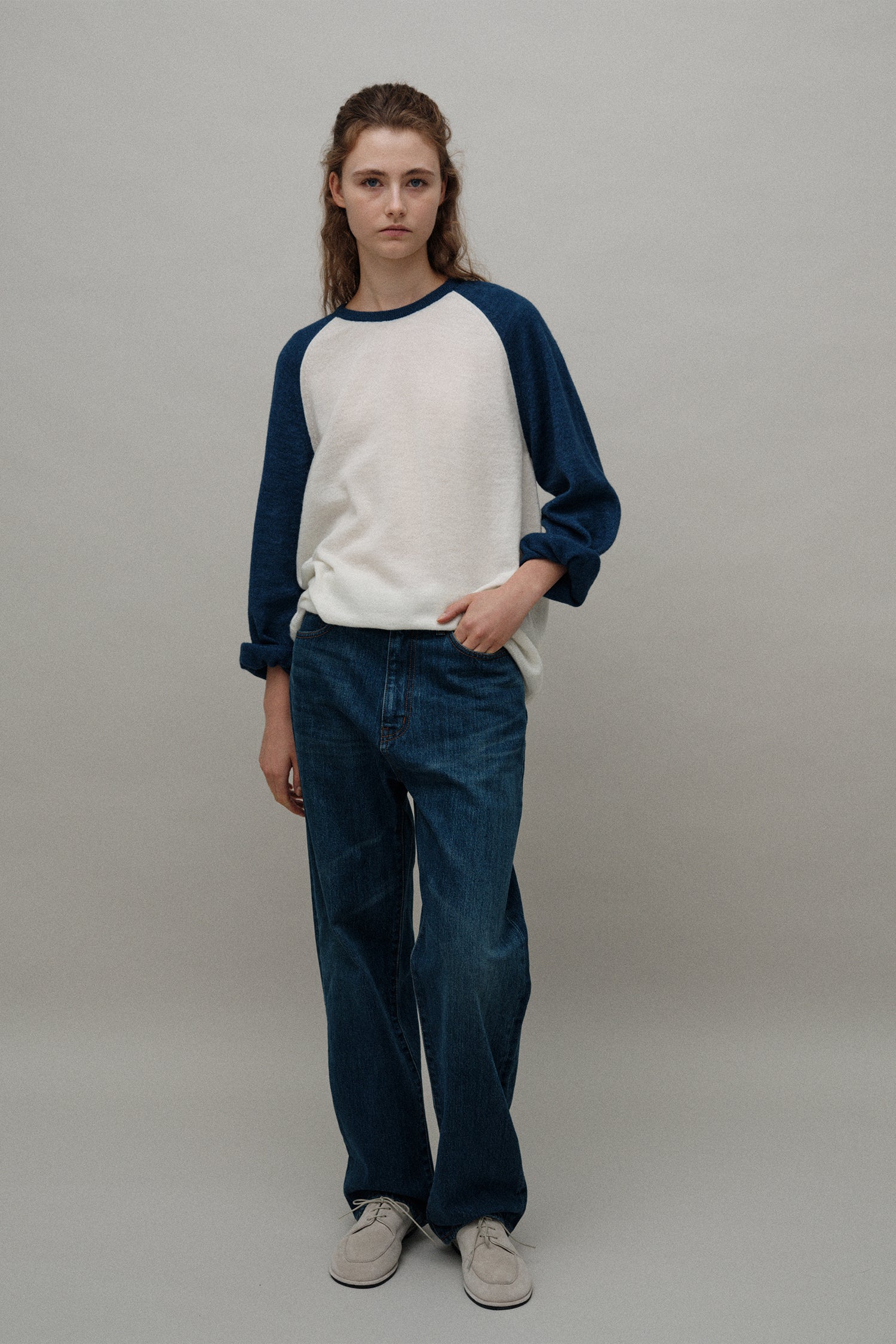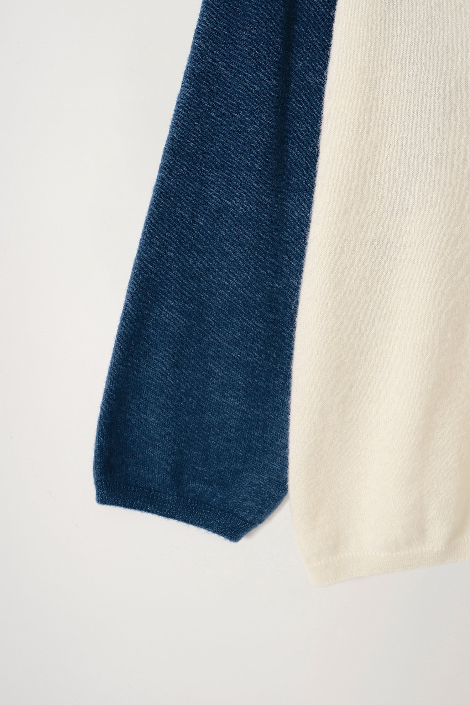 Stunning raglan sleeved knit, with contrasting blue sleeves to its off-white main body. The knit itself is a mixture of wool, nylon and the softest mohair, rendering it warm, luxurious and extremely versatile temperature-wise.
