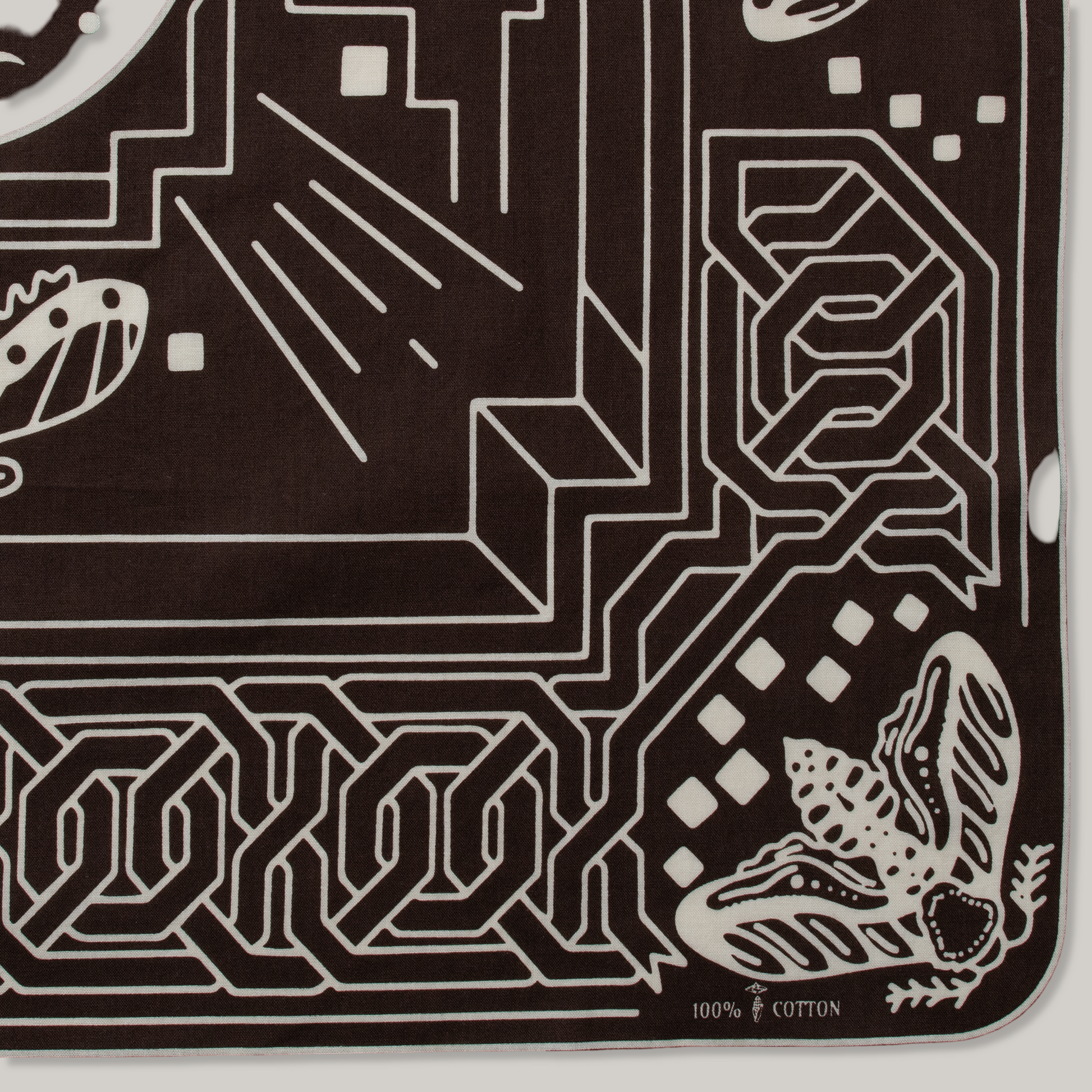 Ga is the Japanese word for moth. Alessio Vitelli and Jonathan had a short chat about updating the Nighthings design. So please take this as a sort of version 2.0 but with a new spin. Hence the new name. Drawing inspiration from vintage Turkey Red bandannas the outside border features an intricate crochet design, moths are partnered with a confetti pattern. In the centre of the design is the guiding light, blasting out from the phases of the moon and two lanterns. We really like the idea of keeping the content here realistic so have kept the colour palette dark on this. Using a sort of brown/green/black colour here. Very much like mulch. This is very drastically different from their usual designs, and for good reason, hoping to really diversify their artwork styles.