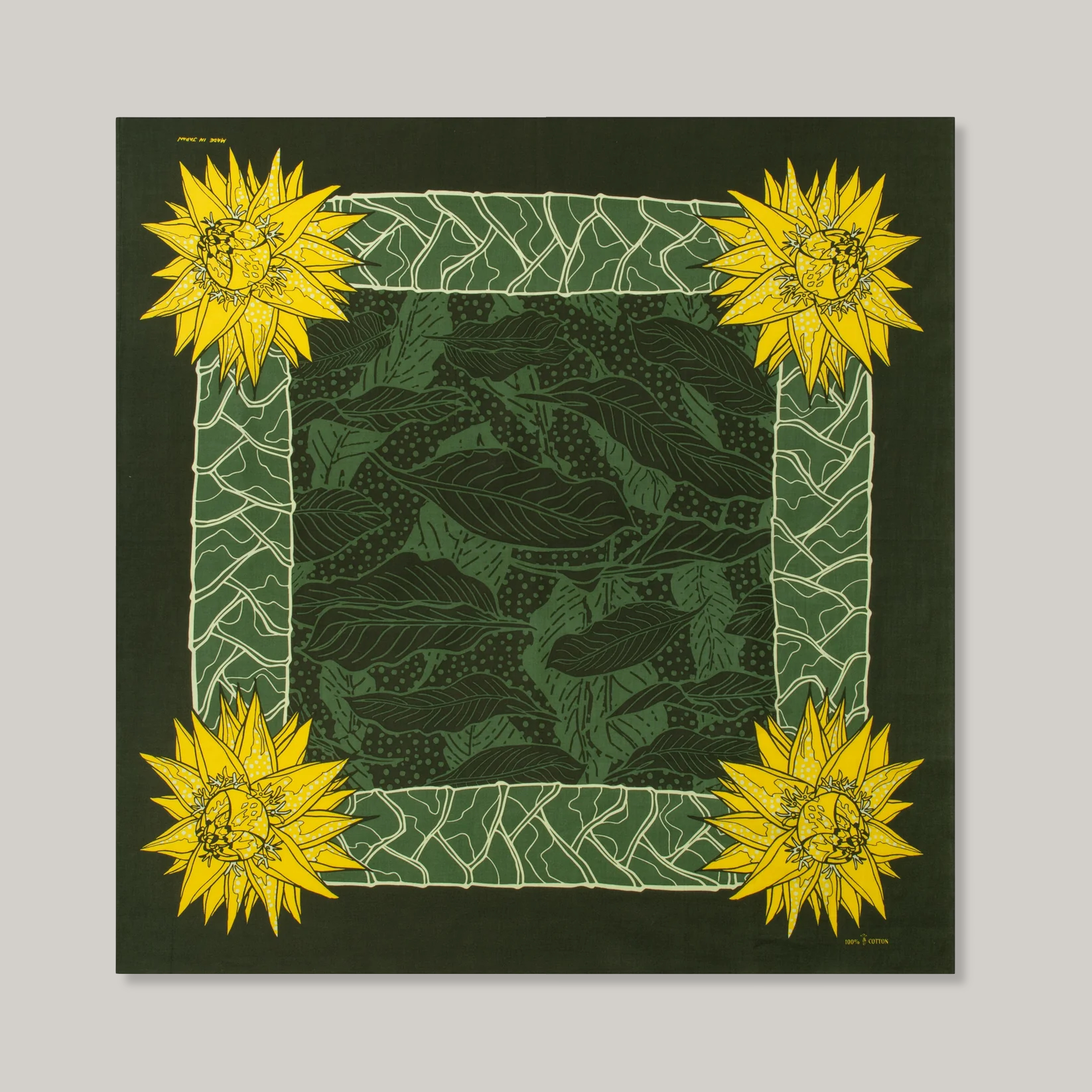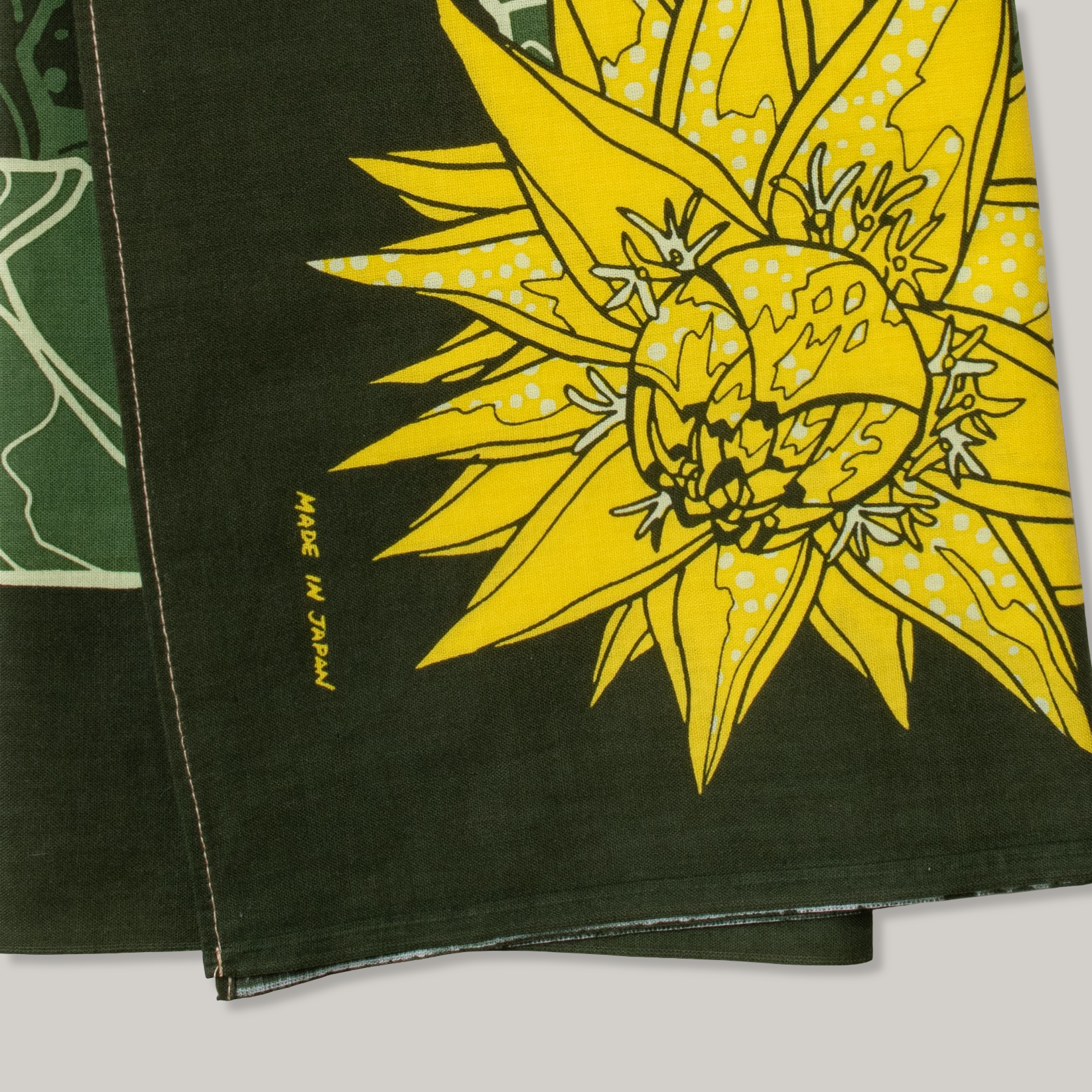 This design is based-off my favourite plant. The Golden Lotus Banana is a native plant to the Yunan area of China. Yurika and I went over some of the photos of the Lotus Banana which I grow at my home in Japan. We have made this design simple, as all the details are from the actual plant itself. The banana leaf camo centre adds just the right amount of repeat pattern. The darker composition makes this a bandanna great to coordinate with all-year-round.