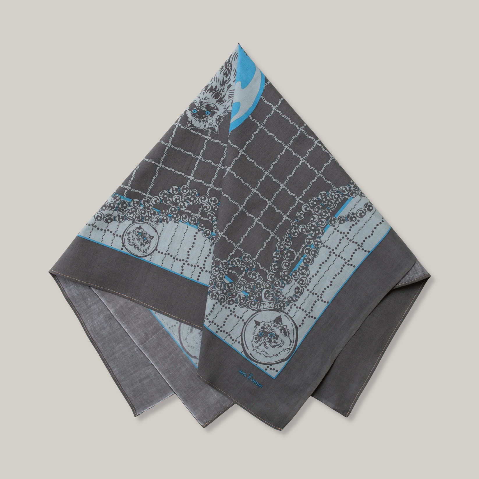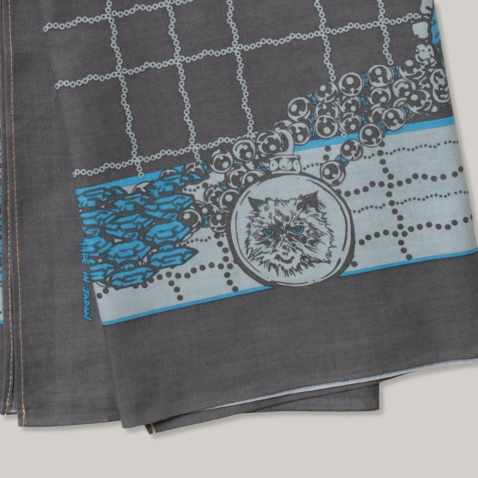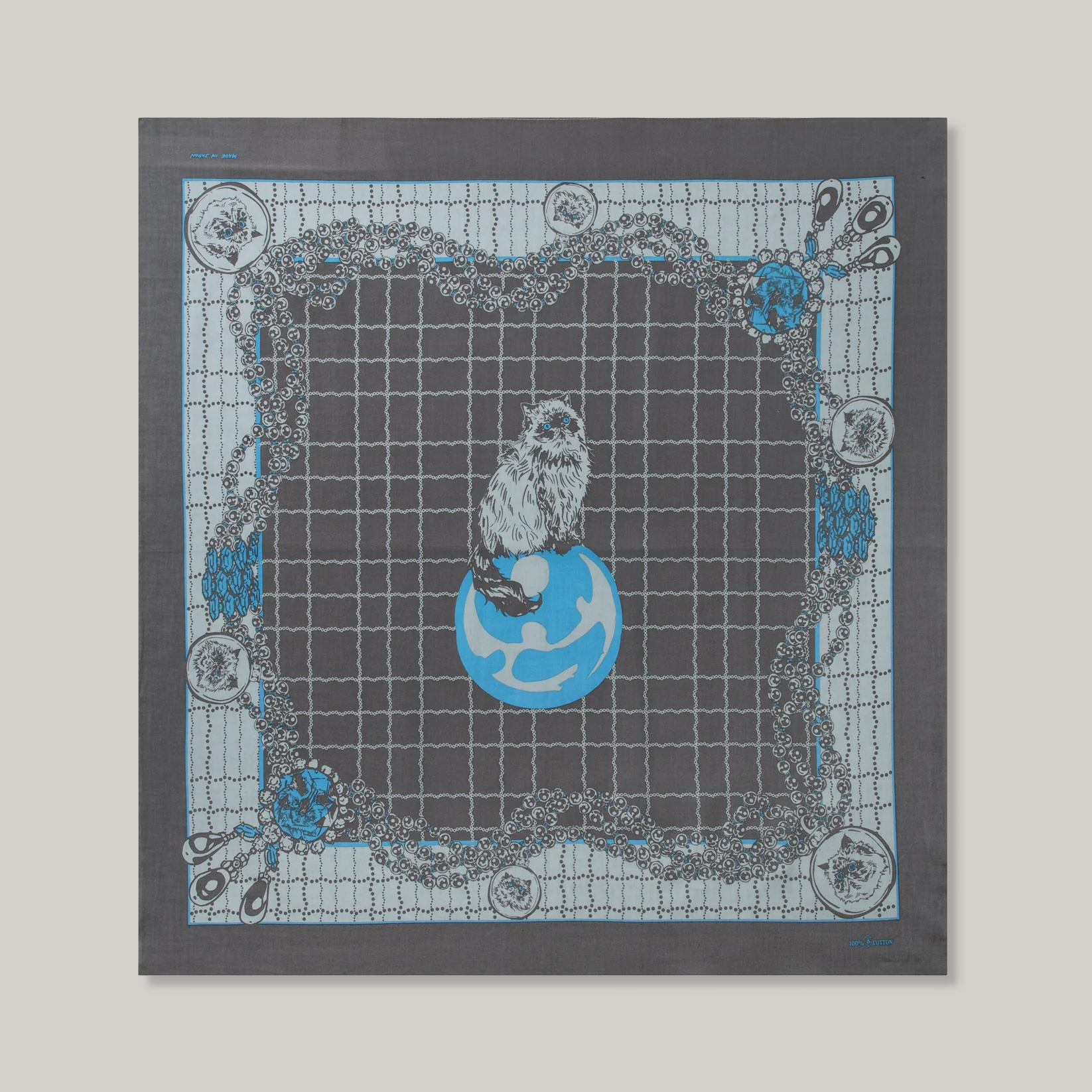 Oreo is an acquaintance’s cat that I quite fancy. He is a himalayan and considerably charming. This bandanna is not only a testament to his cuteness but also a love letter to our feline friends. Yurika and I started this design with a little influence from Cartier scarves. We like the baroque atmosphere of this one. Mixing pearls and gems is one of our favorite things to do. We have added the pearl necklace check into the design as well. The colors compliment each other nicely and really pull together this cat themed piece. Folding and tying this bandanna in a variety of ways will show off certain parts of the design more than others. Please keep this in mind when wearing, so you can show off your favourite personal design bits.