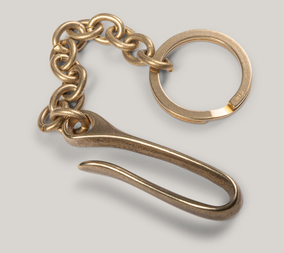 Solid brass belt hook and key chain from Kobashi Studio Japan. Keep your keys hooked on or even your wallet. The chain is produced using a 1960's chain making machine and the hook is designed to fit belts of 3-4mm thickness.