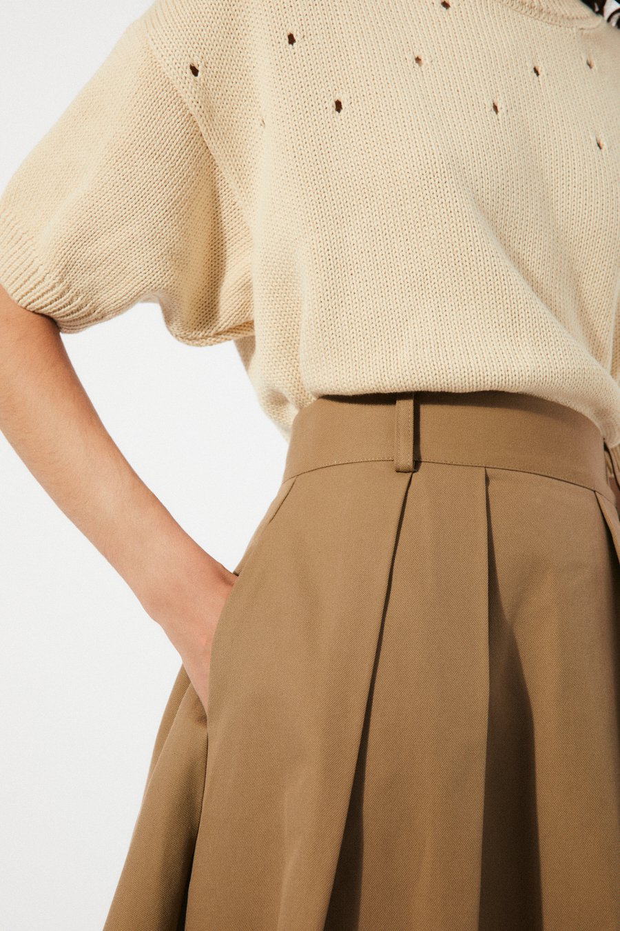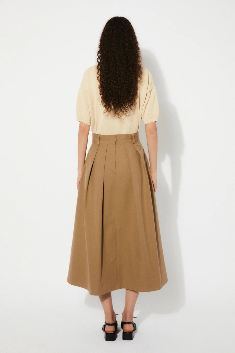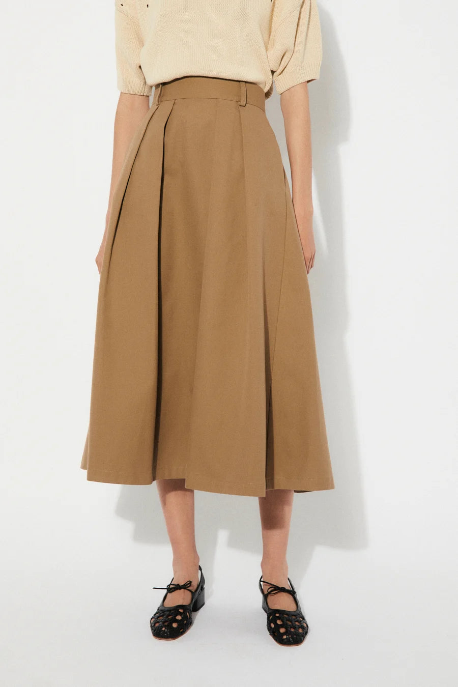Circle skirt in premium cotton twill. High-waisted midi style with hidden zipper at the back. Discreet pockets on the side seams and decorative pleats on front and back. Belt loops.