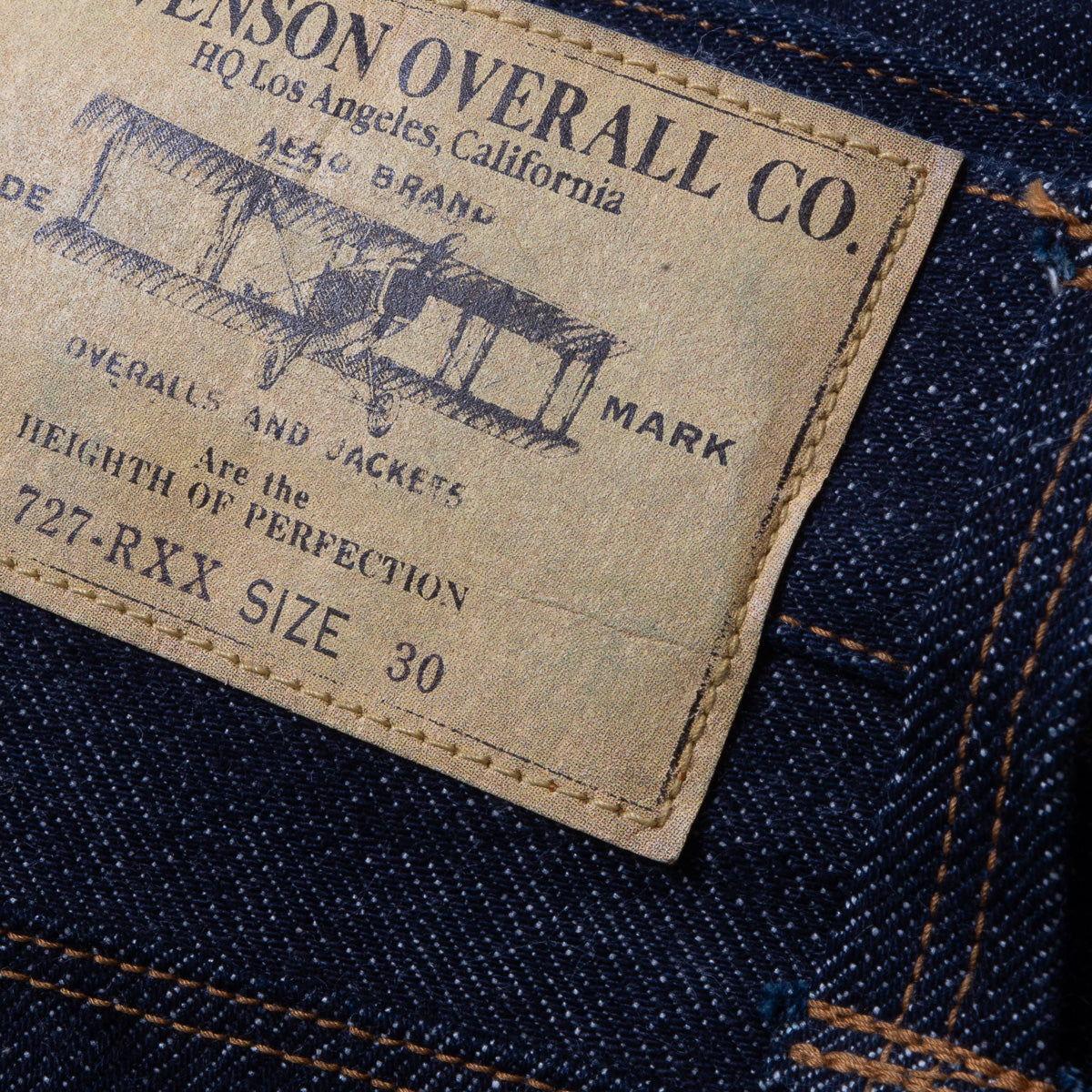 STEVENSON OVERALL CO. 727 LA JOLLA JEANS. The 727 is a very popular slim tapered cut from Stevenson, with low to mid rise. Produced in their signature 14oz green cast denim and single needle stitched throughout, these are perfect for those who prefer a slimmer silhouette.