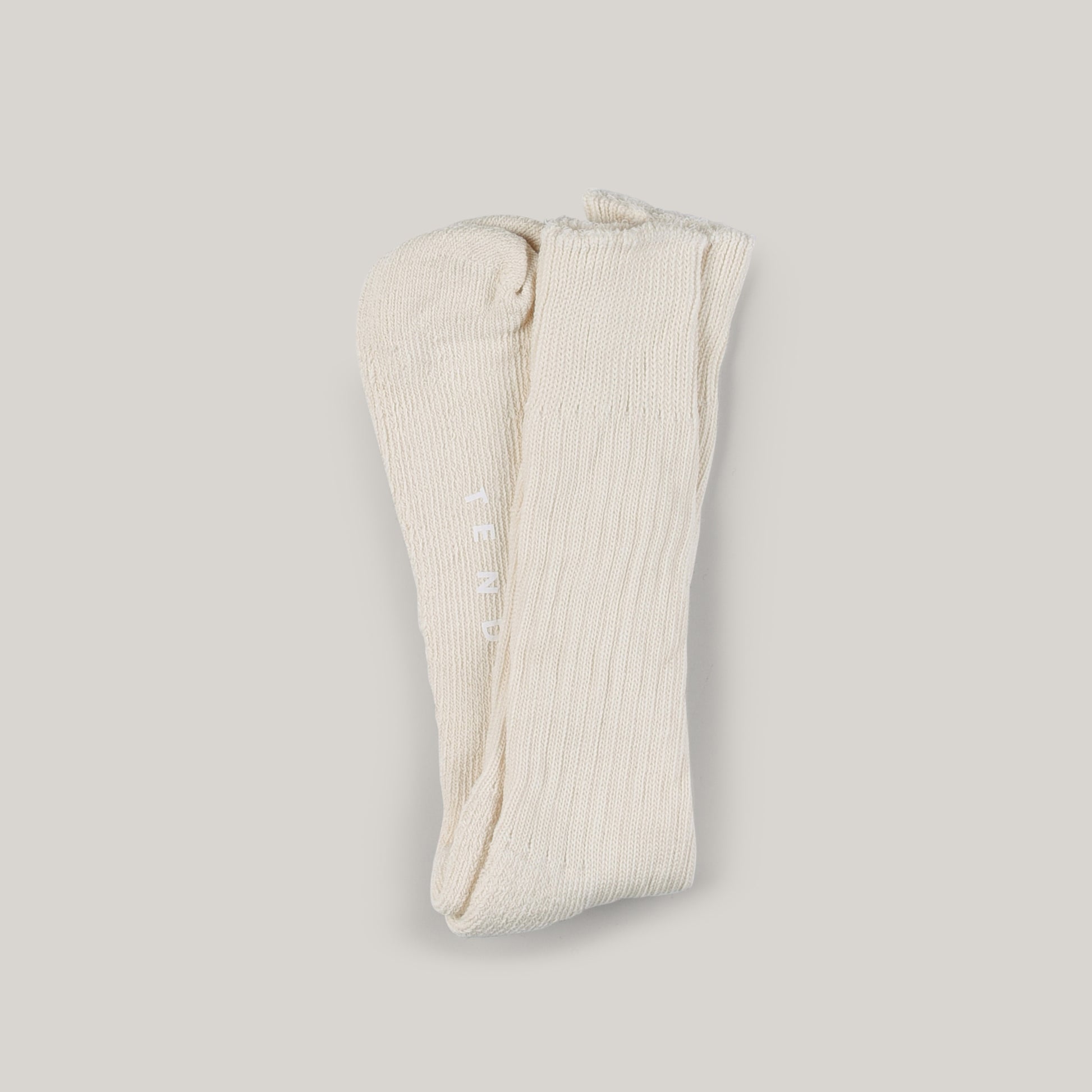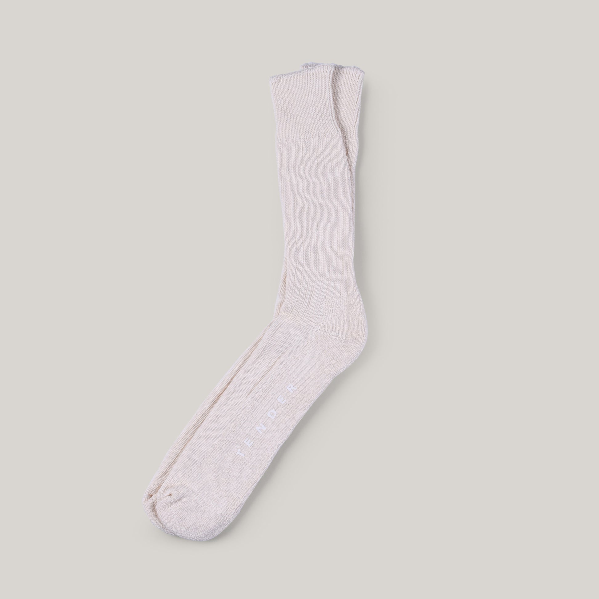 Tender’s rib cotton socks are knitted and hand linked in England from raw unbleached cotton, with nylon for durability, then dyed with natural dyes, or left in their ‘unborn’ natural state like these, in which case they will shrink to fit with the first wash.