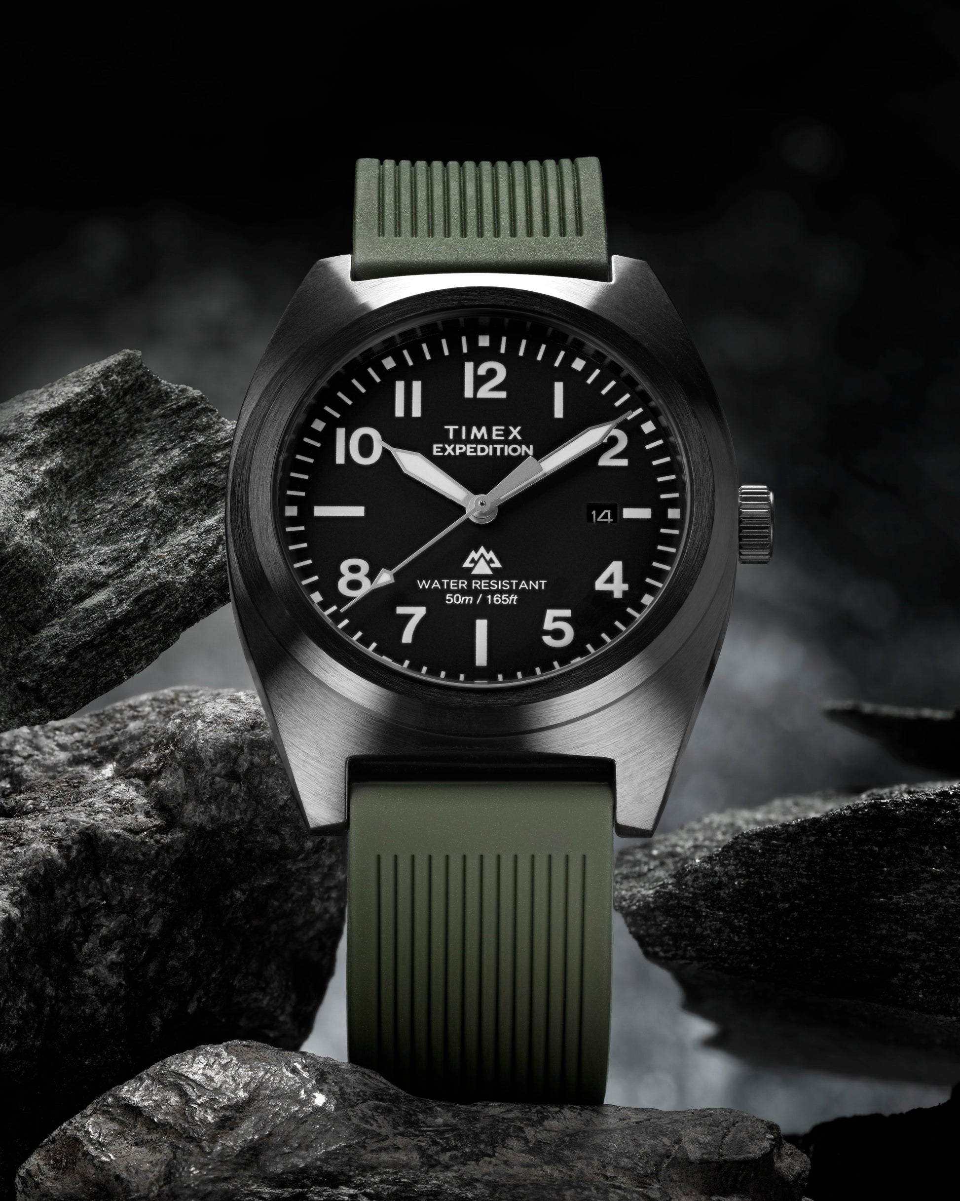 The new Expedition Capstone brings a new 39mm brushed case to their Expedition collection. The dial is protected by a flat mineral glass crystal and includes luminant hands and a date window beside 3 o'clock. They’ve paired it with a two-piece green silicone strap that’s soft and flexible on the wrist and equipped with quick-release spring bars for easy strap changes on the go.