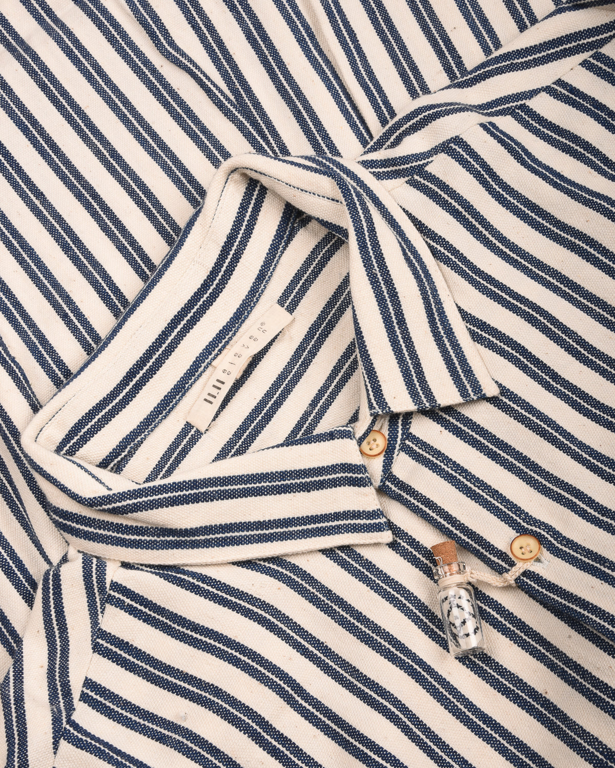 Relaxed fit unisex shirt made in kala cotton yarn dyed stripes in natural indigo. Kala cotton is indigenous to Kachchh and by default organic, as the farmers do not use any pesticides and synthetic fertilizers. It is a purely rain-fed crop that has a high tolerance for both disease and pests.