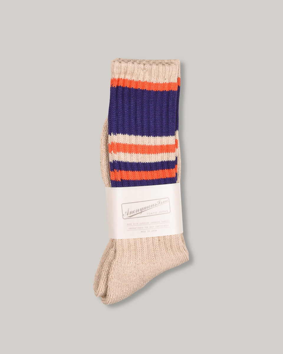 A thick, luscious sports sock in natural coloured cotton and hemp, with differing stripes of purple and green to tantalise your toes.