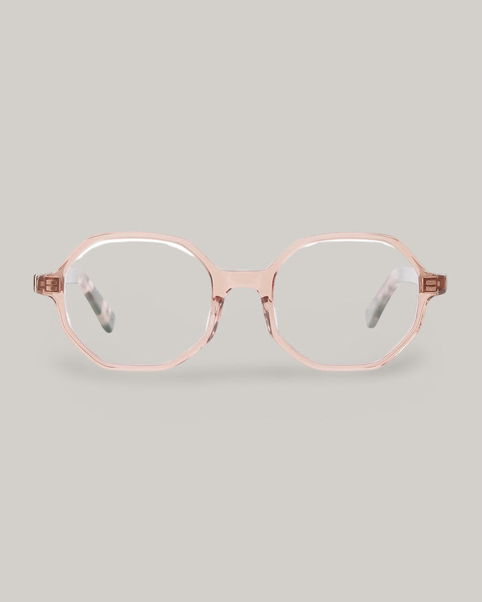 Continuing his concept of the piano collection and expanding the 'ais' frame he released, this is a more delicate, version in acetate. Using an embedded hinge for a cleaner look, this classically French-style frame is given a more playful silhouette by using a pink frame and amber tortoiseshell arms to elevate it from the norm. A hard multi coat UV400 is applied to the lenses.