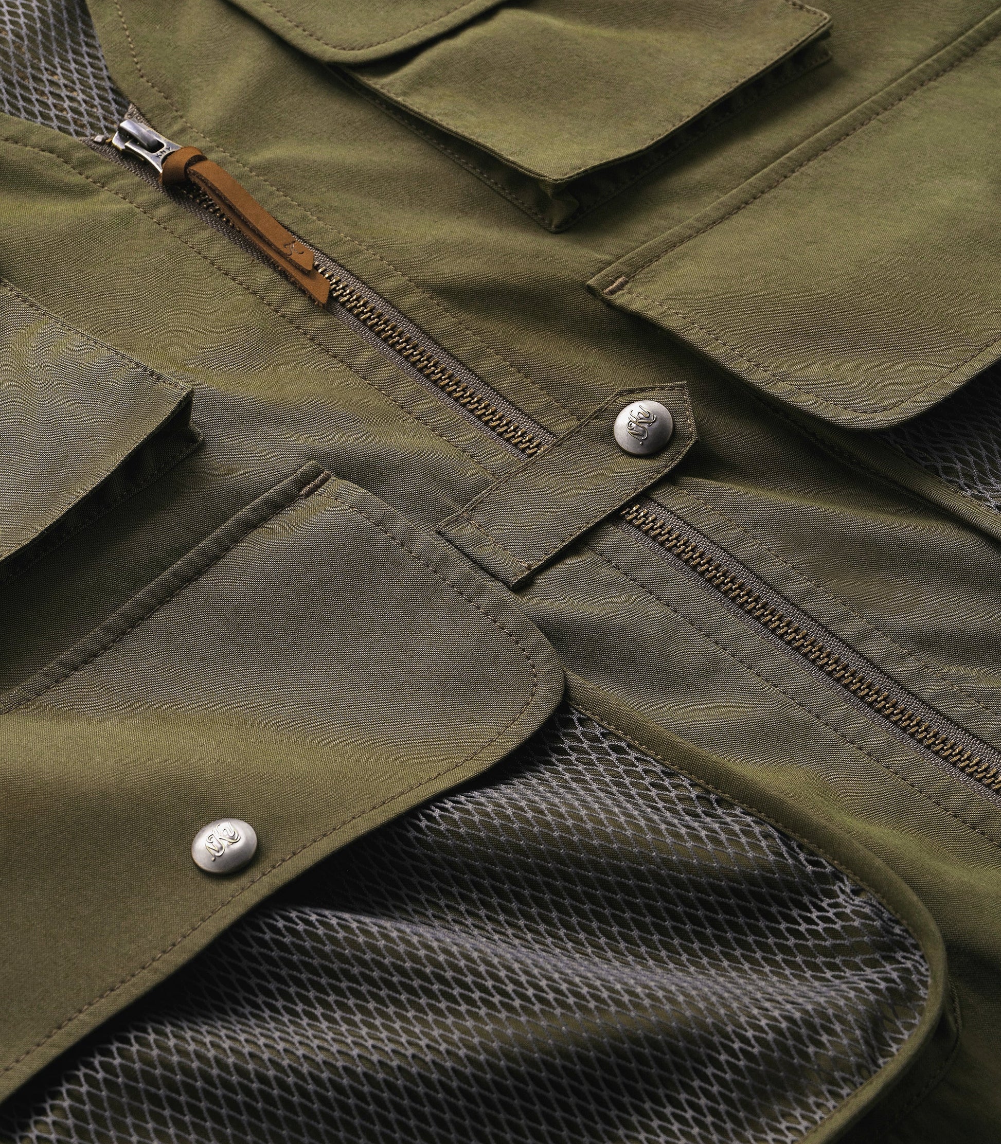 Designed with friend of the brand and photographer Joe Greer. Together they have designed a functional vest cut from an Italian cotton & nylon cloth from Olmetex Mills. Equipped with front and back pockets for balanced carry, custom spring snaps and a two-way custom YKK zipper with leather pull.