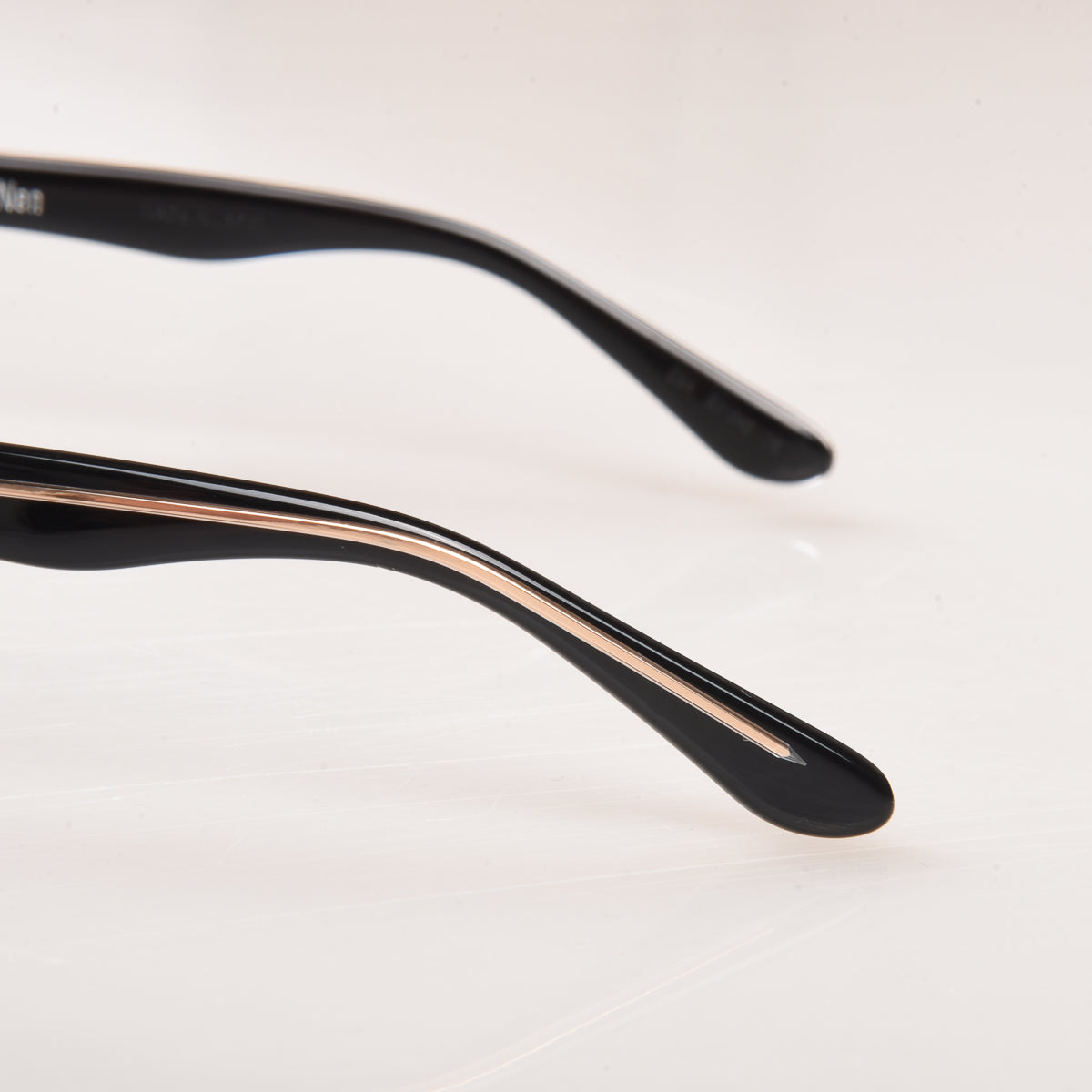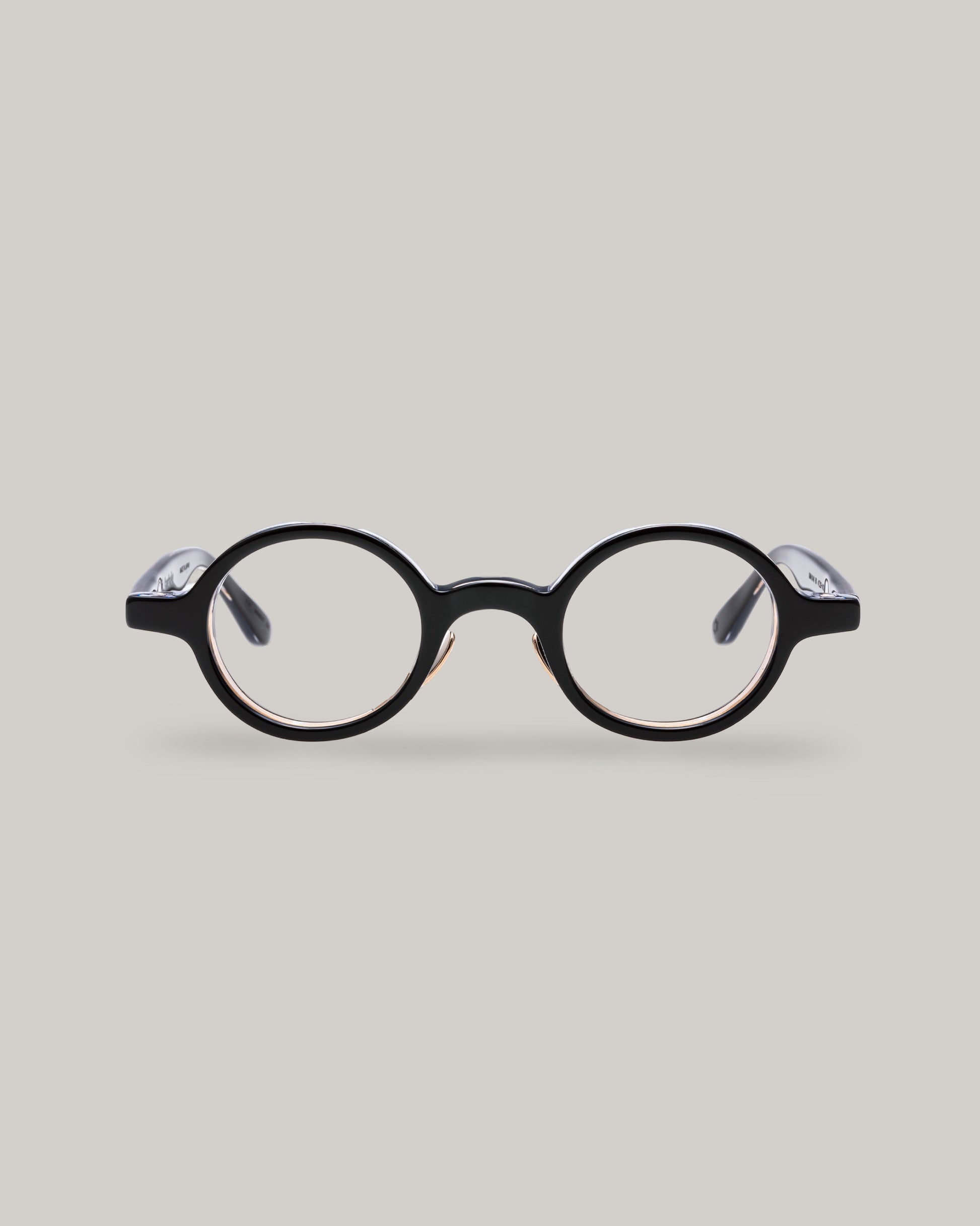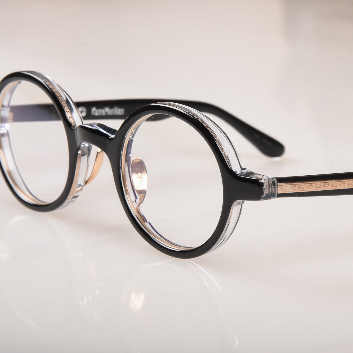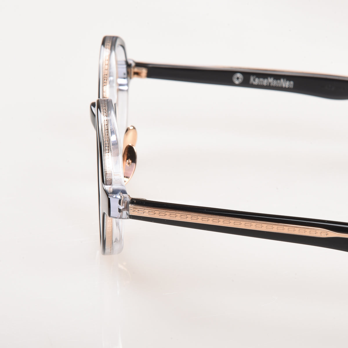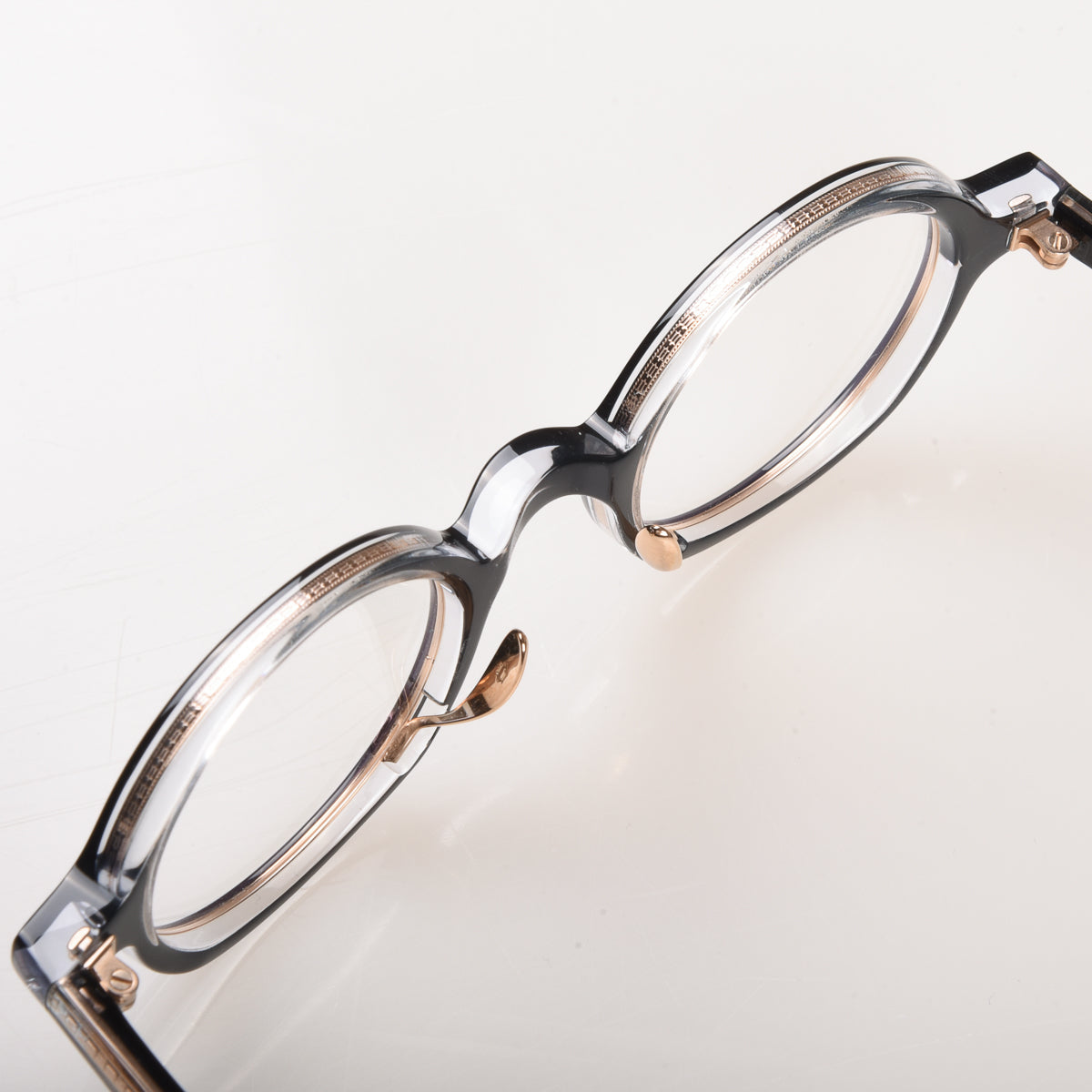 Our first foray into the optical combination of acetate combined with titanium, and this doesn't disappoint. Nicely rotund with transparent contrasting acetate against the black, gold inner rims and nose pads and fantastic filigree on the outer rims. Gorgeous.