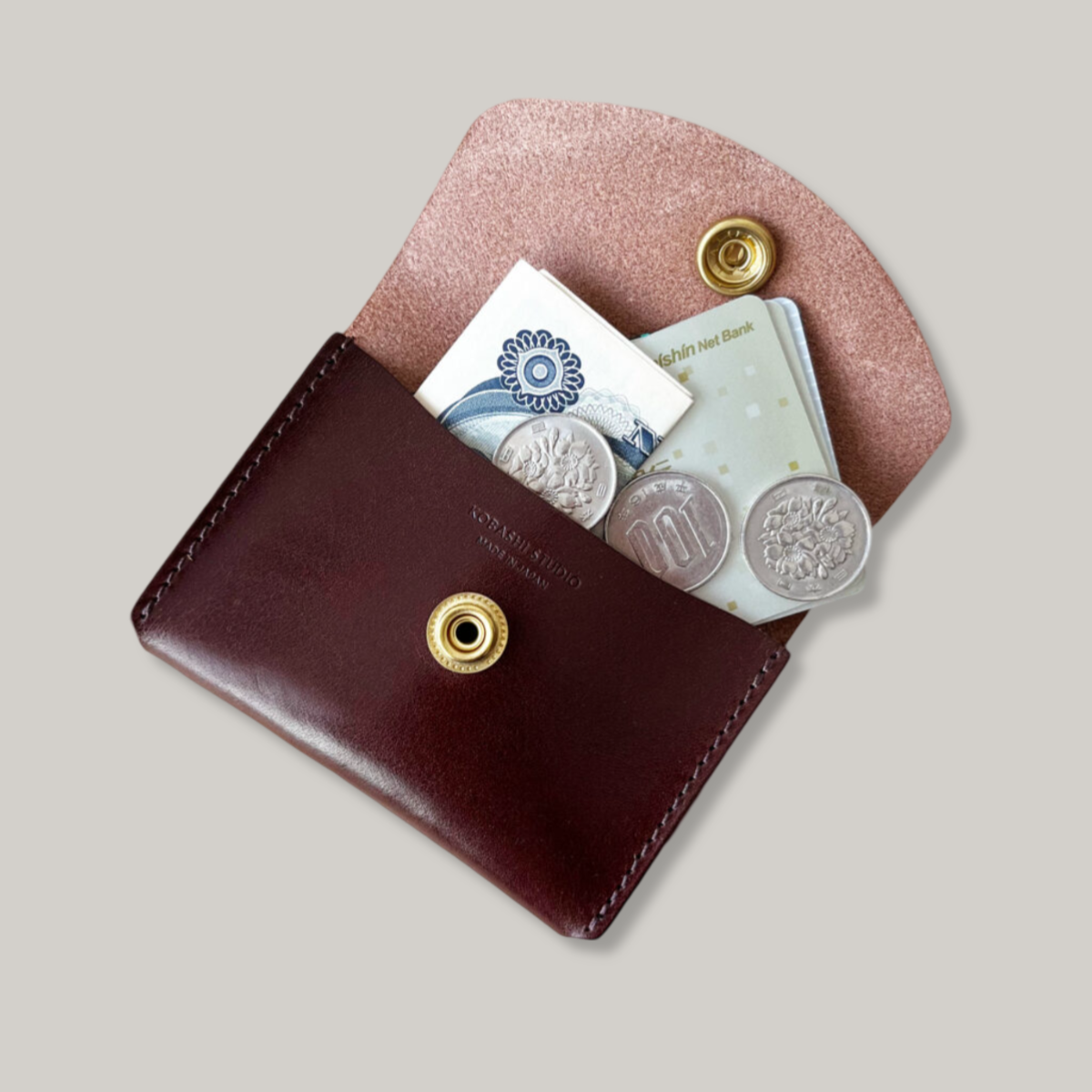 Card case style compact wallet, dark brown colour. Holds up to 12 cards. Smart style for carrying cards, folded bills and coins all in one. Shiny Kobashi Studio original saddle leather, 100% vegetable pit tannage manufactured by a tannery in Himeji established in 1905. Edges polished and dyed by hand. Minimalist, clean design with no visible logo by Junichi Kobashi. Comes with a wax paper envelope.