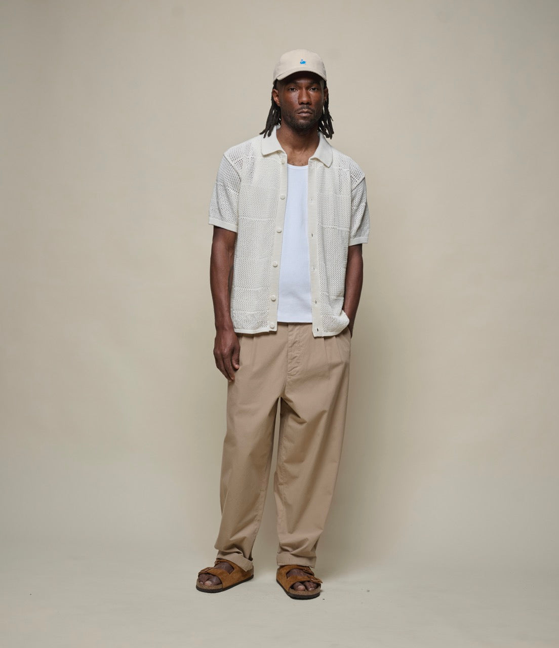 Button front crochet knit top that is soft enough to feel luxurious against the skin, or to be used as a layering piece in warmer climes. knitted hems and sleeves with tonal cat's eye buttons to complete.