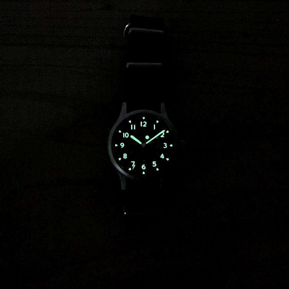 Part of their original watch collection, this is an iteration of US Forces Mil. 01 vintage watch, complete with dome lens and an updated case size expanded to 38mm. The luminescent paint on the numbers, indexes, and hands on the dial uses "LumiNova (R)" paint, which is only allowed to be used on Swiss watches, and has a longer luminescent time and stronger luminescence than regular luminous.