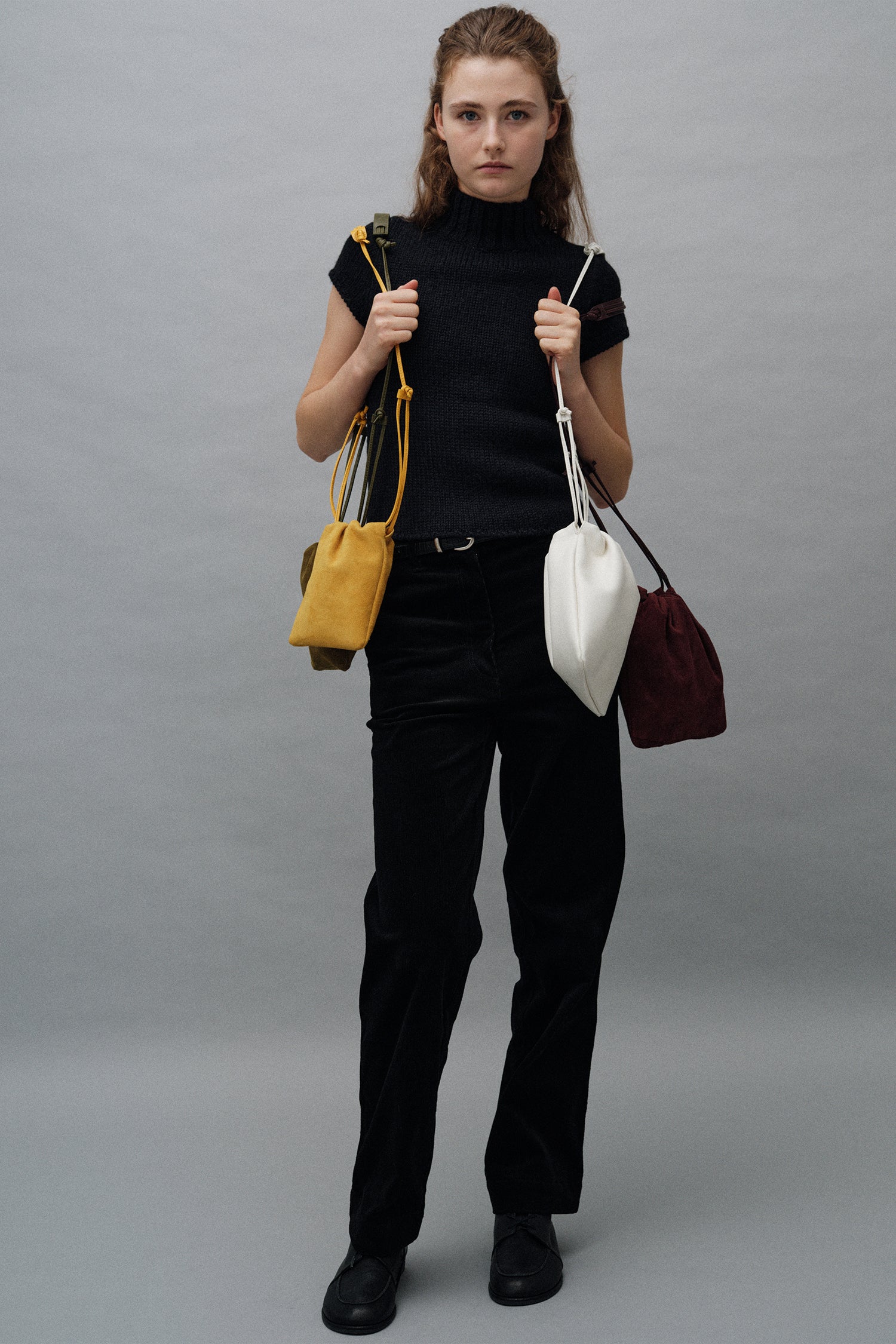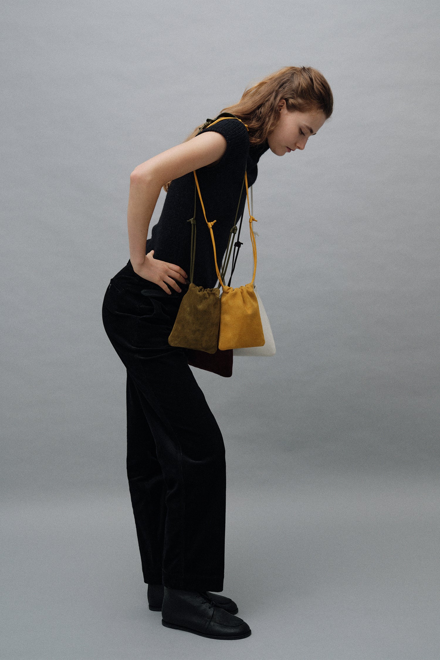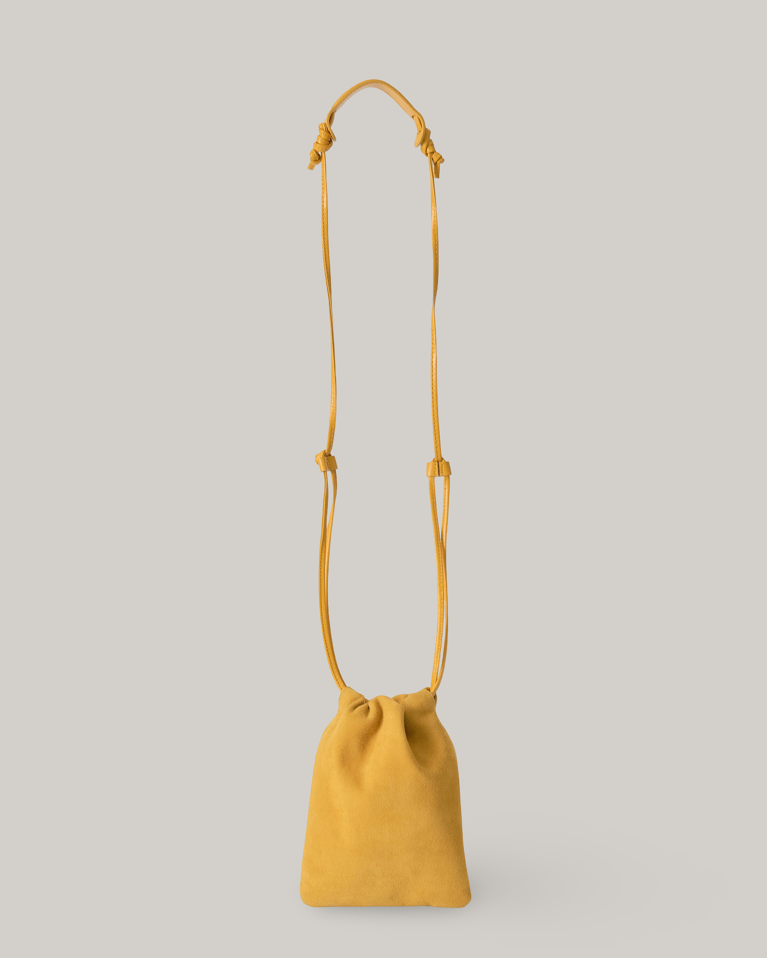 This mini Fatu stands out with its minimalist design. Its practical size, large enough to hold a phone, makes it perfect for casual outings, easily carrying essentials. Crafted from soft lambskin, it naturally ages with age, developing wrinkles and grain. Made from real suede in vibrant colours, it offers a soft, luxurious texture and adds a sophisticated touch to your look with every wear. It can be worn crossbody or as a tote with the detachable strap, boasting a versatile design. The central drawstring closure creates a natural shirring effect, adding a soft curve to the overall silhouette.