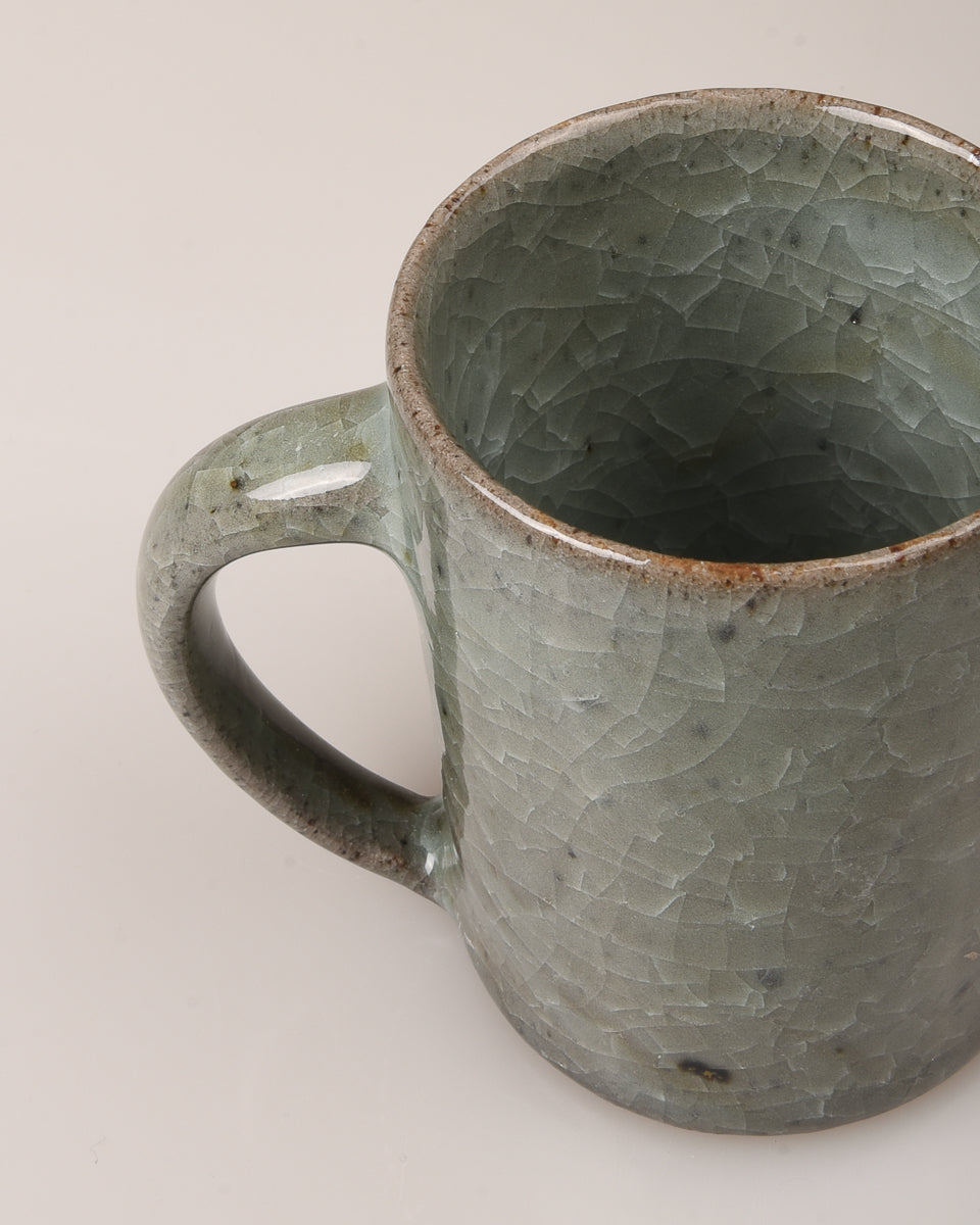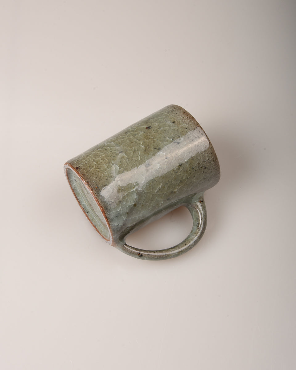 These pieces are made of a blend of hand-dug clays from around Victoria, hand processed and aged in the artist's Kinglake studio. The clay body is very coarse and often contains small stones of basalt that can melt through the glaze surface as dark protrusions. Pieces are fired to 1300c in a fuel-fed reduction atmosphere, this process causes iron oxide to release microscopic oxygen bubbles that are trapped under the glaze surface which cause the blue colour of the glaze. The crazing of the glaze is caused by a difference in shrinkage rates of the glaze and the clay. As the pots cool in the kiln, the glaze tries to shrink, but the clay won't allow it. This causes the stress to be released as hundreds of tiny fractures across the glaze surface