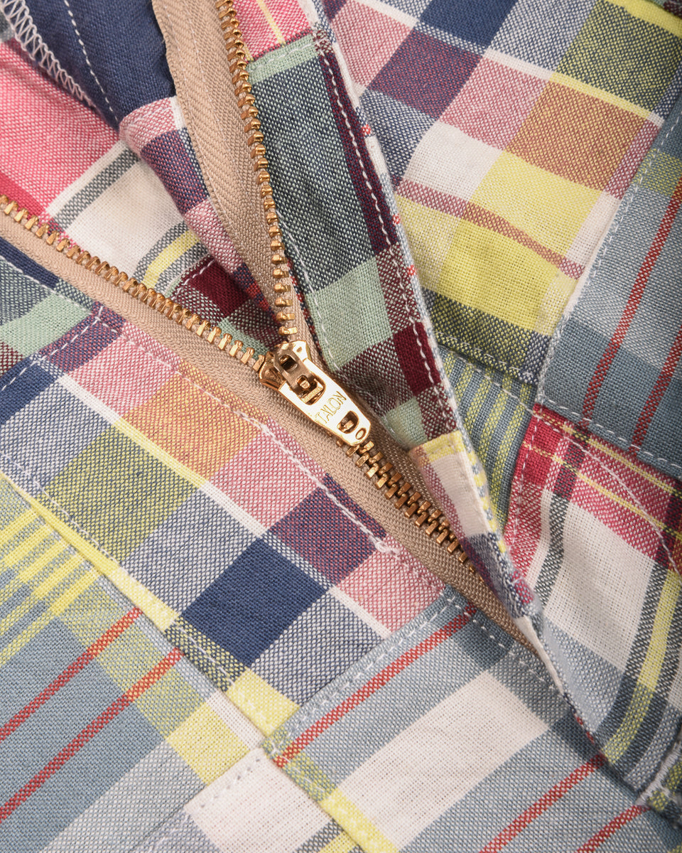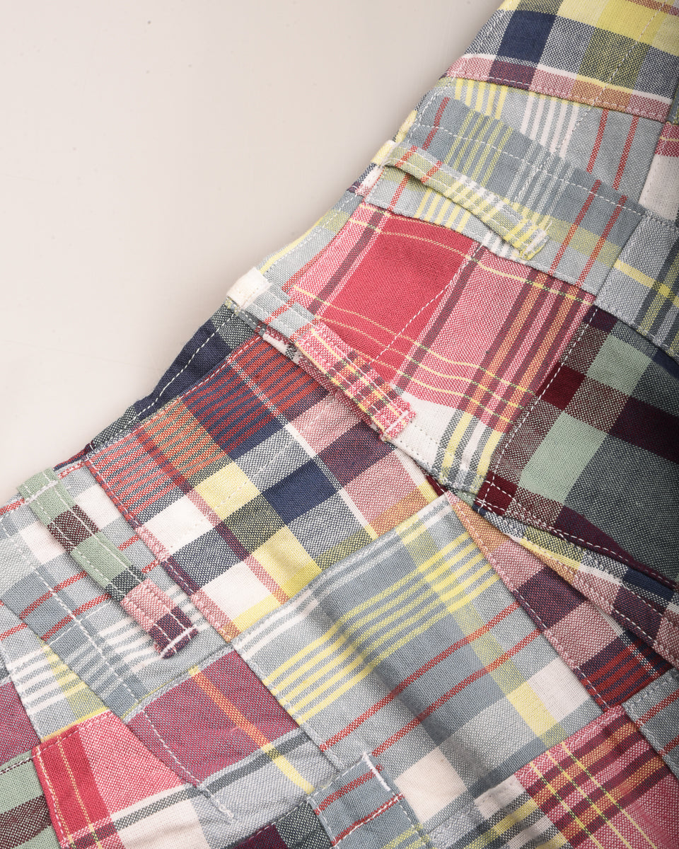 The shirt is made of patchwork checked fabric woven in Madras (now Chennai) in southeastern India, an essential part of the Ivy League style of the 1950s and 1960s. It features a texture and colour that cannot be achieved with domestically produced items.