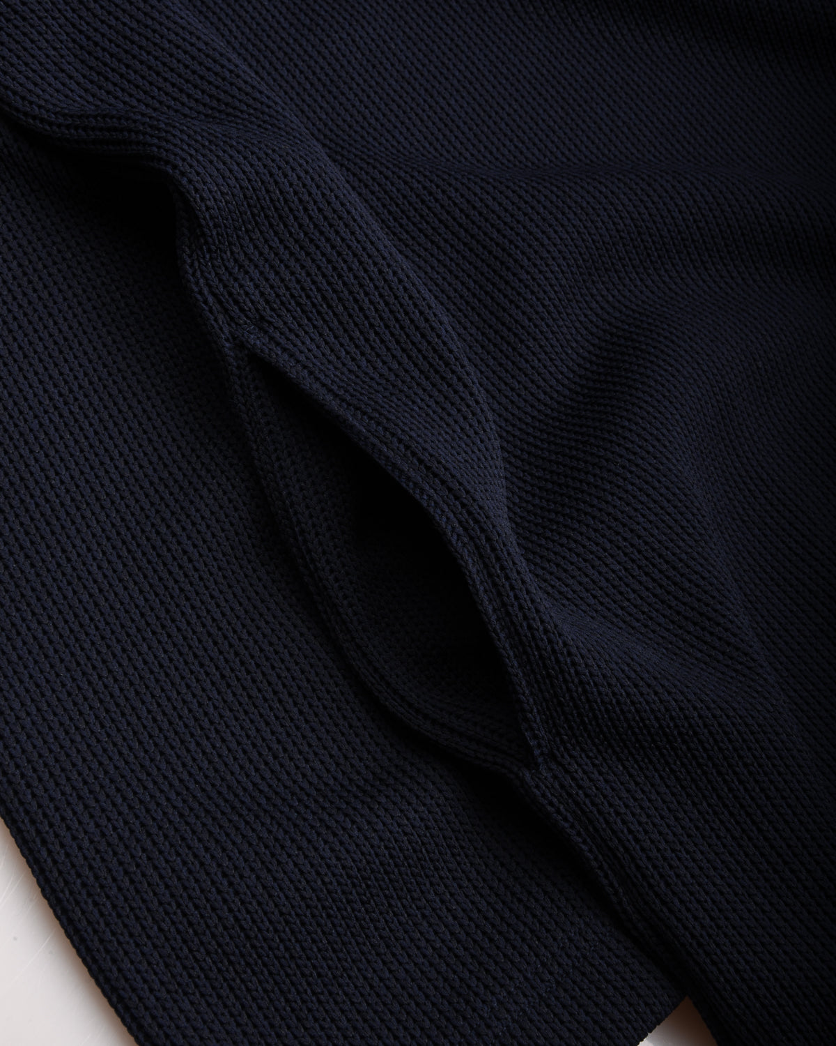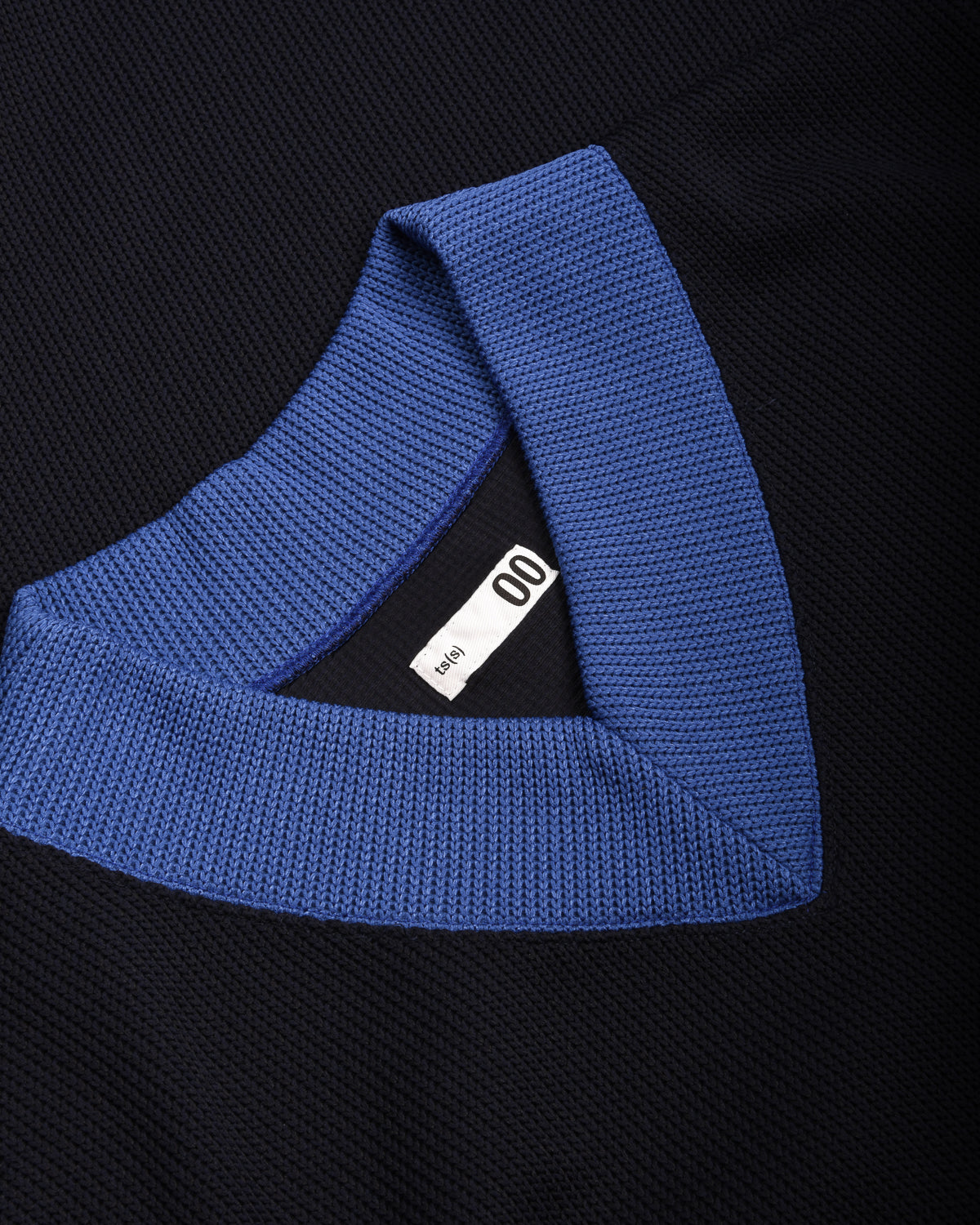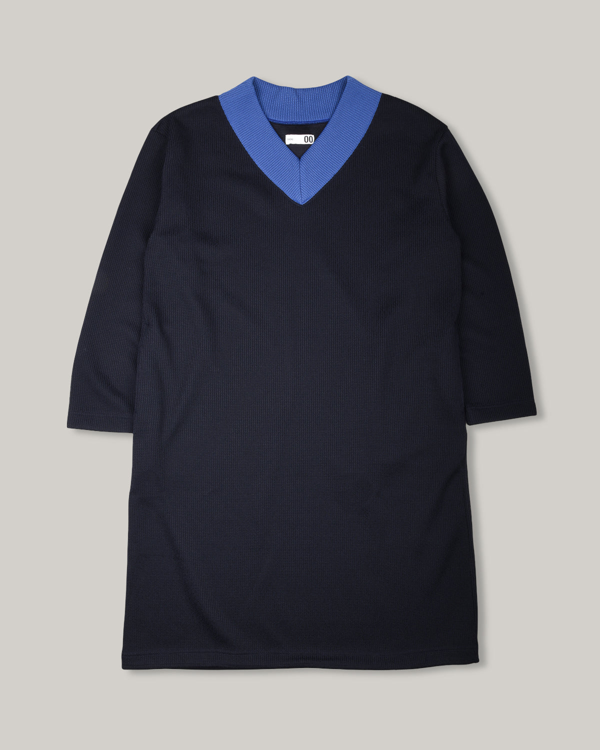 This oversized dress is constructed in a double jersey rib fabric with a large contrasting v-neck collar in lighter blue. Much like a t-shirt/ sweater dress it can be used a single piece through almost all of the year. Also, it has pockets as all dresses should.